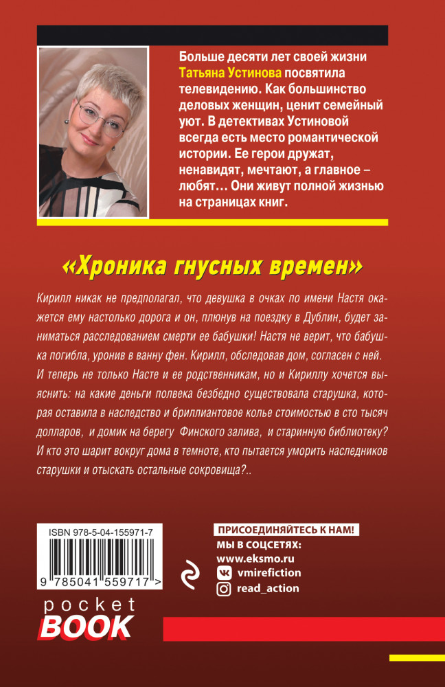 Хроника гнусных временВ данный момент этот товар отсутствует в продаже. Возможно, у нас найдется аналогичный или похожий товар здесь. Серия: Русский бестселлер (обложка) Кирилл никак не предполагал, что девушка в очках по имени Настя окажется ему настолько дорога, и он, плюнув на поездку в Дублин, будет заниматься расследованием смерти ее бабушки! Настя не верит, что бабушка погибла, уронив в ванну фен. Кирилл, обследовав дом, согласен с ней. И теперь не только Насте и ее родственникам, но и Кириллу хочется выяснить: на какие деньги полвека безбедно существовала старушка, которая оставила в наследство и бриллиантовое колье, стоимостью в сто тысяч долларов, и домик на берегу Финского залива, и старинную библиотеку? И кто это шарит вокруг дома в темноте, кто пытается уморить наследников старушки и отыскать остальные сокровища? |