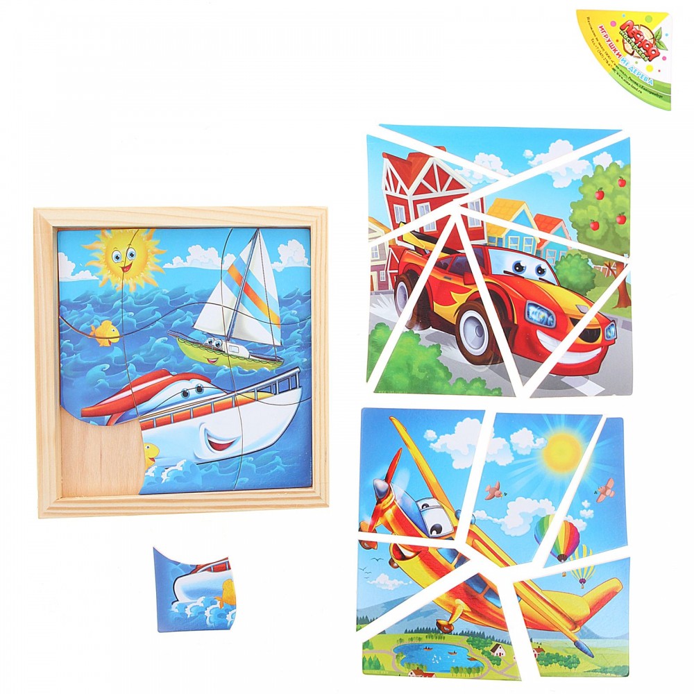 В нём 3 изображения, расположенные друг под другом. Все имеют свои собственные цвета, поэтому нужные фрагменты легко найти даже в общей кучке. Увлечённо складывая картинки, переходя от простой к более сложной, ребёнок будет развивать логику, координацию движений и усидчивость. Малютка не успеет утомиться, ведь в каждом пазле совсем немного деталей, собирающихся в специальную рамку и легко вынимающихся из неё. Фрагменты имеют простую вырубку, поэтому с этой головоломкой справится даже кроха.