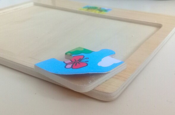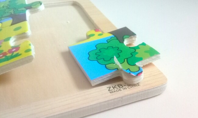 Пазл, конечно, разочаровал. Редко ставлю такие низкие оценки - вообще не люблю писать отрицательные отзывы, но очень уж расстроила покупка. У нас много деревянных пазлов, все они нами очень любимы, но все они крашеные, без наклеек. На этом рисунок наклеен. Наклеен некачественно, картинка отходит от фанеры. При этом разрезана основа очень плохо - детали очень трудно разъединить и, соответственно, практически невозможно для маленького ребенка соединить в картинку. Не ставлю единичку (наверное, зря) только потому, что очень хорошая рамка - аккуратная, светлая, приятная. Но это единственный и совсем не существенный плюс.