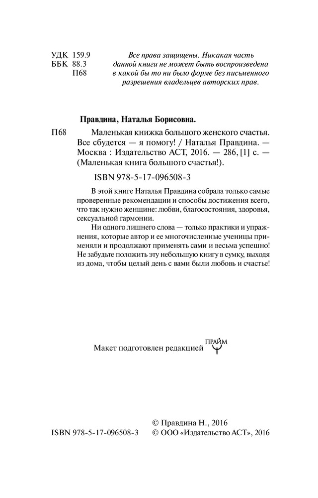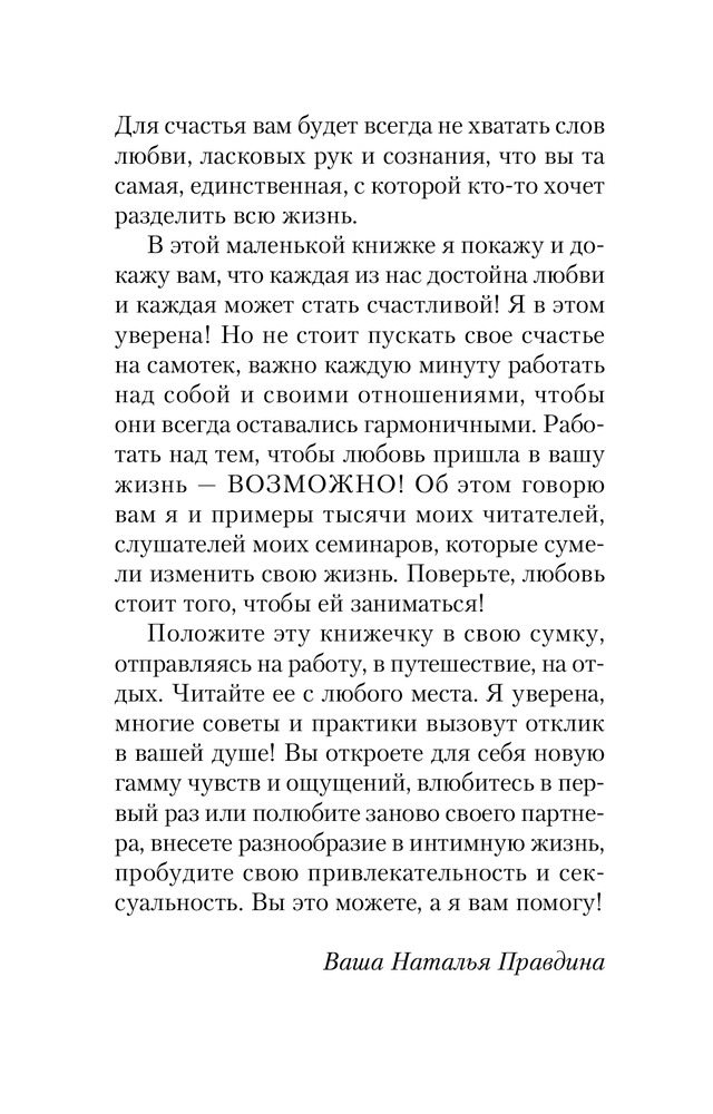 В данный момент этот товар отсутствует в продаже. Возможно, у нас найдется аналогичный или похожий товар здесь. Серия: Маленькая книга большого счастья В этой книге Наталья Правдина собрала только самые проверенные рекомендации и способы достижения всего, что так нужно женщине: любви, благосостоянии, здоровья, сексуальной гармонии.