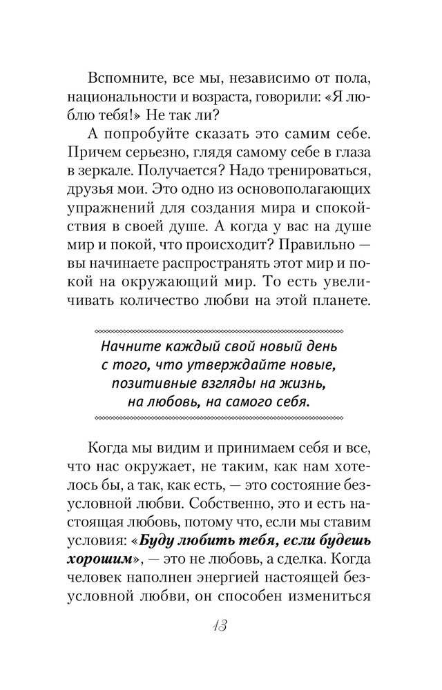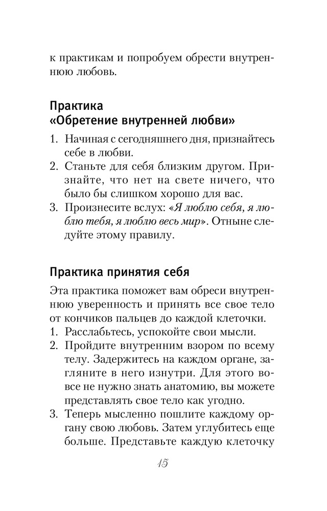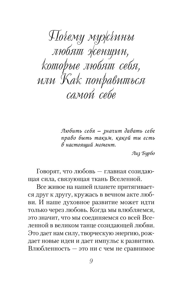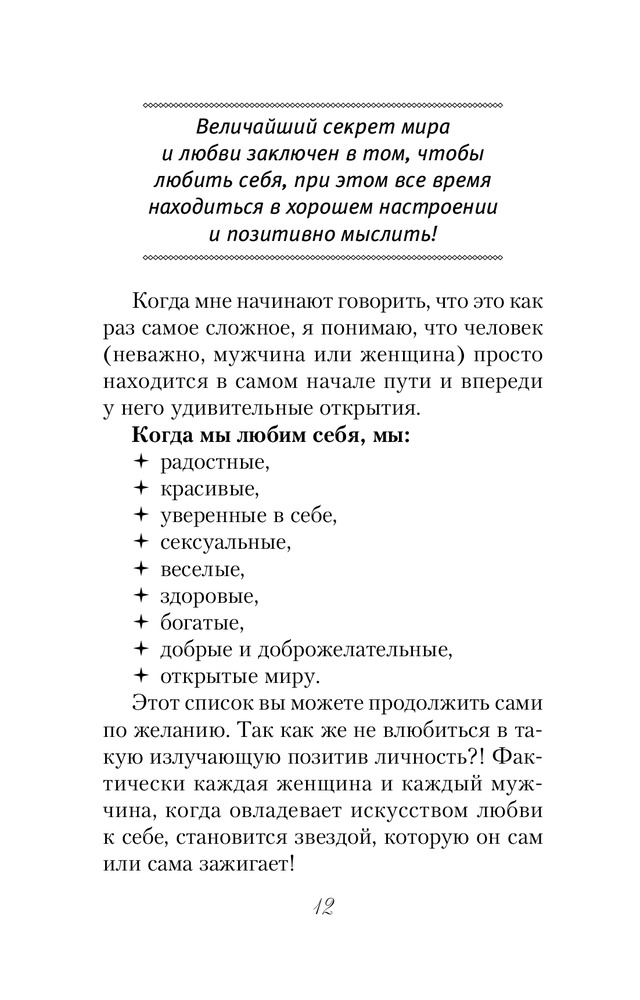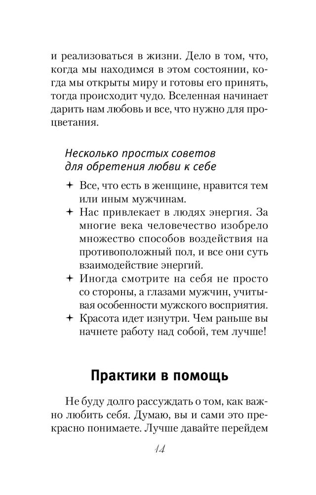 Ни одного лишнего слова — только практики и упражнения, которые автор и ее многочисленные ученицы применяли и продолжают применять сами и весьма успешно! Не забудьте положить эту небольшую книгу в сумку, выходя из дома, чтобы целый день с вами были любовь и счастье!