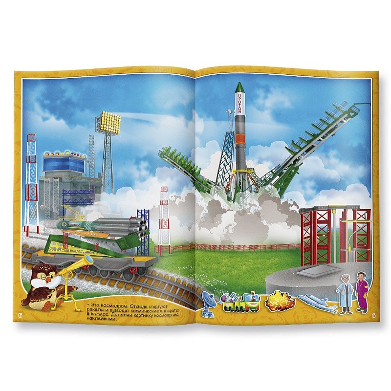 Расклеивая наклейки, малыши узнают, какие планеты есть в Солнечной системе, какие космические аппараты помогают людям исследовать космос. Побывают в особенном «космическом доме» - здесь космонавты живут и занимаются научными работами, и обязательно - на космодроме. Ведь ракета взлетает не с бетонной дорожки, как самолёт, а со специальной стартовой площадки вертикально вверх.