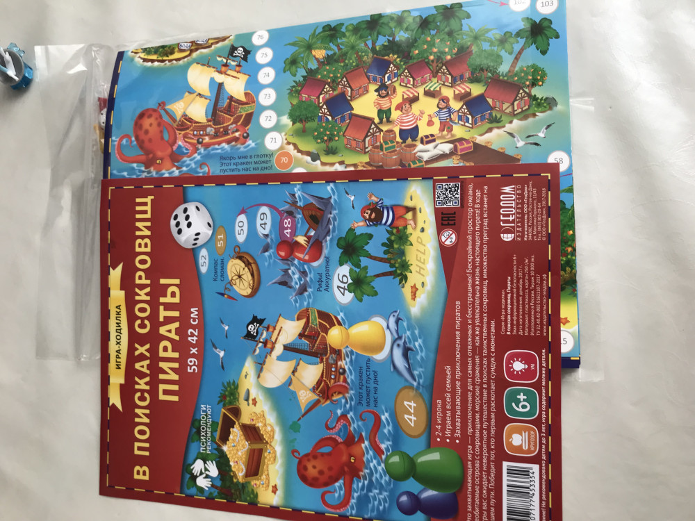 Купила игру для 4-летнего сына. Ему игра понравилась. Игровое поле на тонком картоне. Картинки красочные, с симпатичными пиратами. В комплект игры, помимо карты, также входят 4 разноцветные фишки и 1 кубик. Ставлю оценку "4" из-за того, что игра упакована в прозрачный пакет, а не в картонную коробку. Жалко, что производитель не посчитал нужным упаковать игру в коробку.