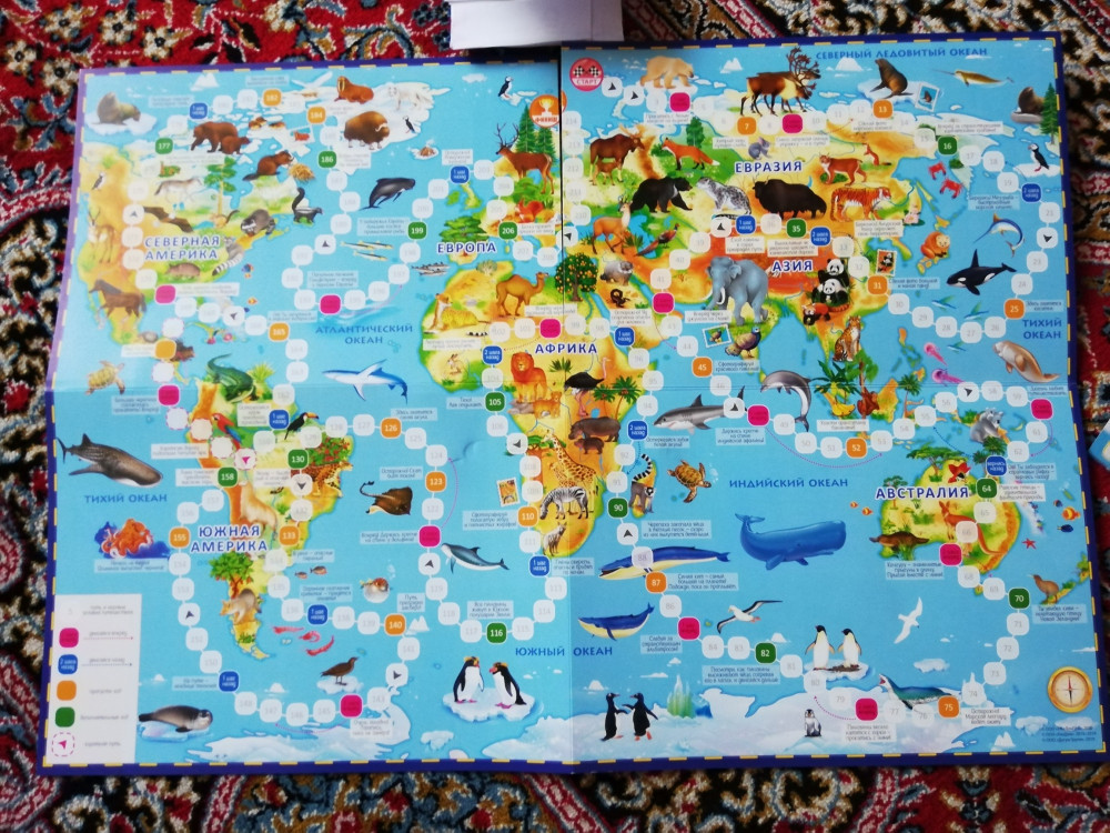 Интересная игра- бродилка. Сыну 5 лет очень понравилось, каждый вечер играем всей семьей. Заодно он узнает про континенты, моря и животных.