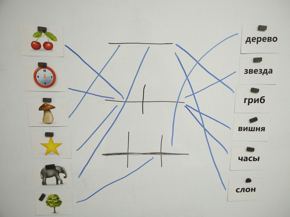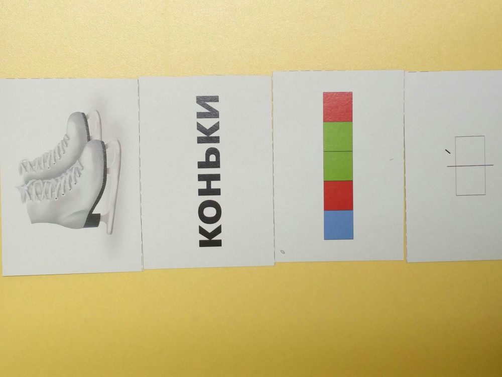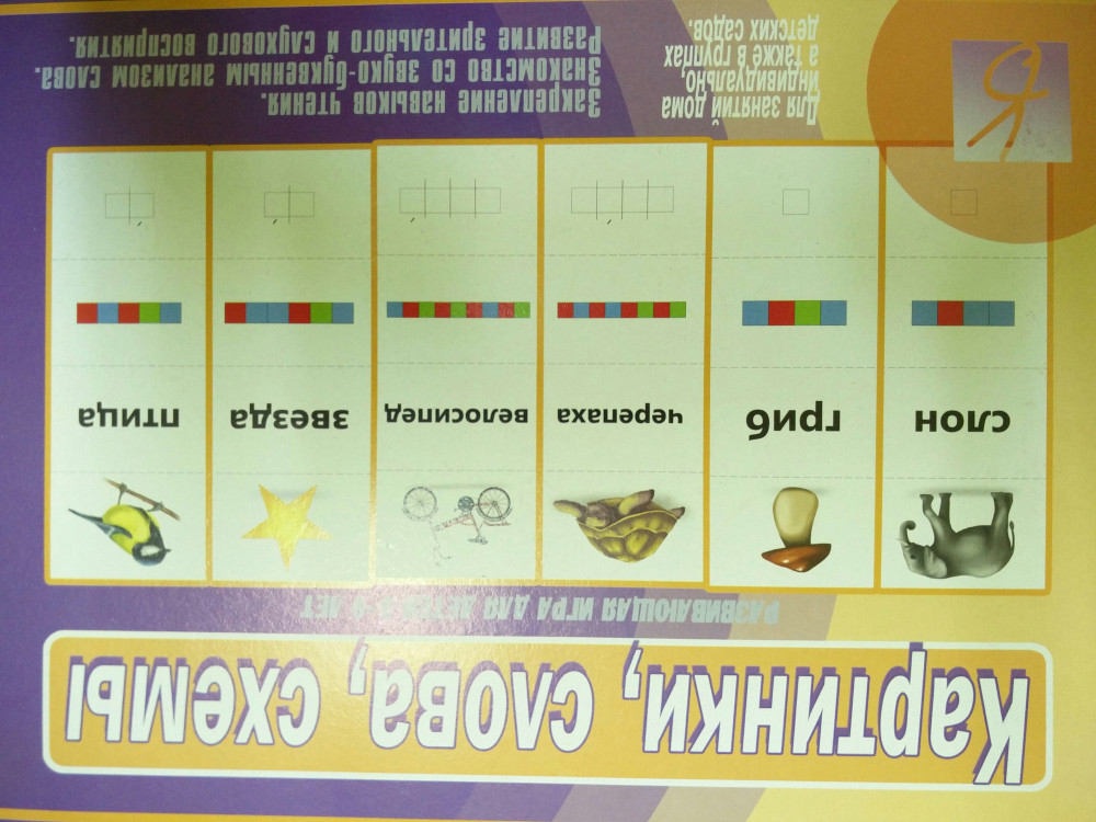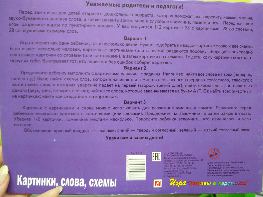 Перед началом игры разрежьте карты по пунктирным линиям. У вас получится 112 карточек: 28 с картинками, 28 со словами, 28 со звуковыми схемами слов.