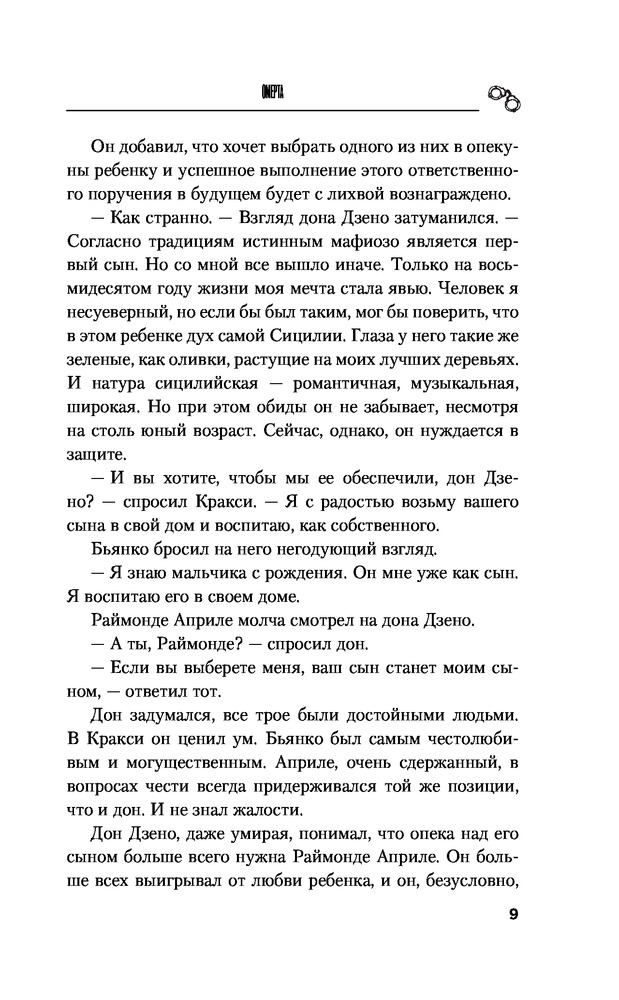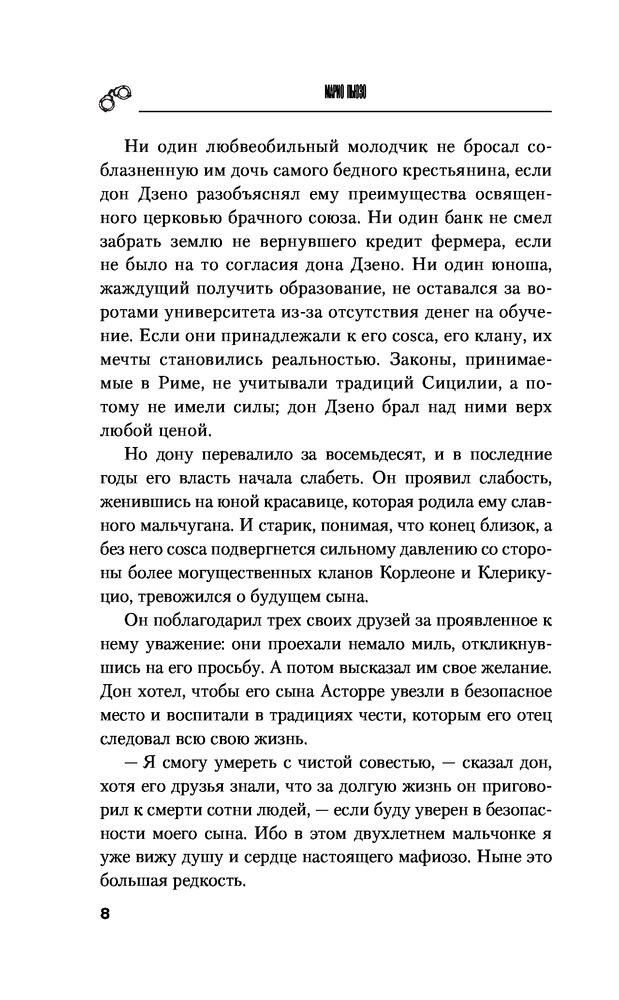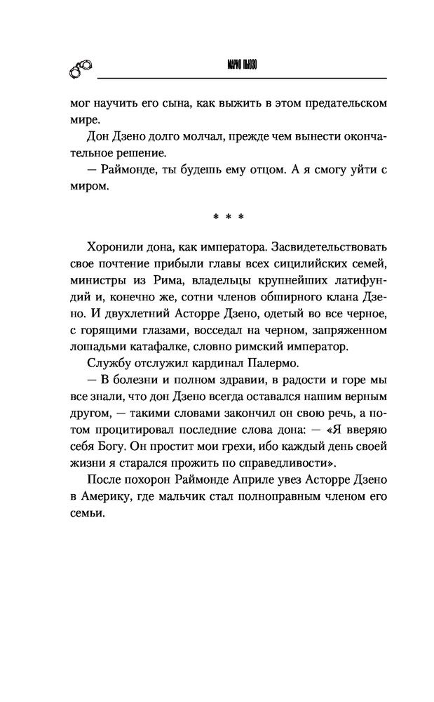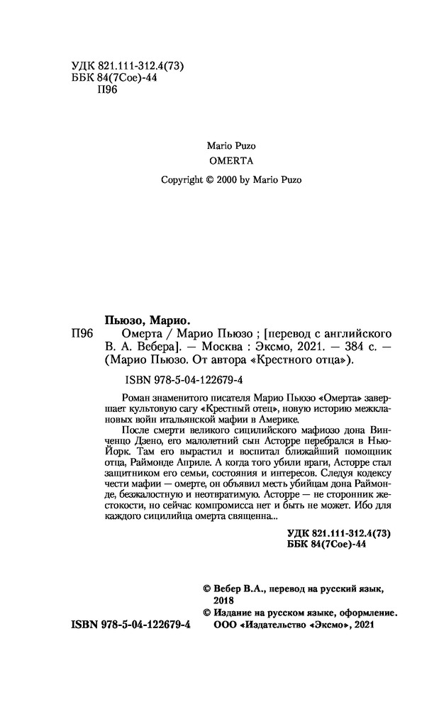 ОмертаВ данный момент этот товар отсутствует в продаже. Возможно, у нас найдется аналогичный или похожий товар здесь. Серия: Марио Пьюзо. От автора «Крестного отца» Этот роман продолжает тему знаменитых бестселлеров о мафии «Крестный отец» и «Последний дон», послуживших основой для нашумевших кино- и телевизионных фильмов. Его действие разворачивается в Нью-Йорке, куда после смерти отца, великого сицилийского мафиозо дона Дзено, попадает его сын, Асторре. Воспитанный ближайшим помощником Дзено доном Раймонде Априле, Асторре становится, когда приходит время, защитником его детей, состояния и интересов. Следуя кодексу чести мафии, омерте, он начинает войну с дельцами наркобизнеса, которые стремятся расширить дело, а потому одного за другим убирают тех, кто пытается сопротивляться. |