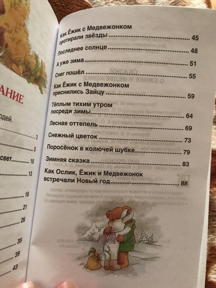 Замечательная книжка с замечательным содержание и картинками. Картинки красочные, нарядные. Содержание включает короткие интересные рассказы о приключениях ежика и медвежонка.