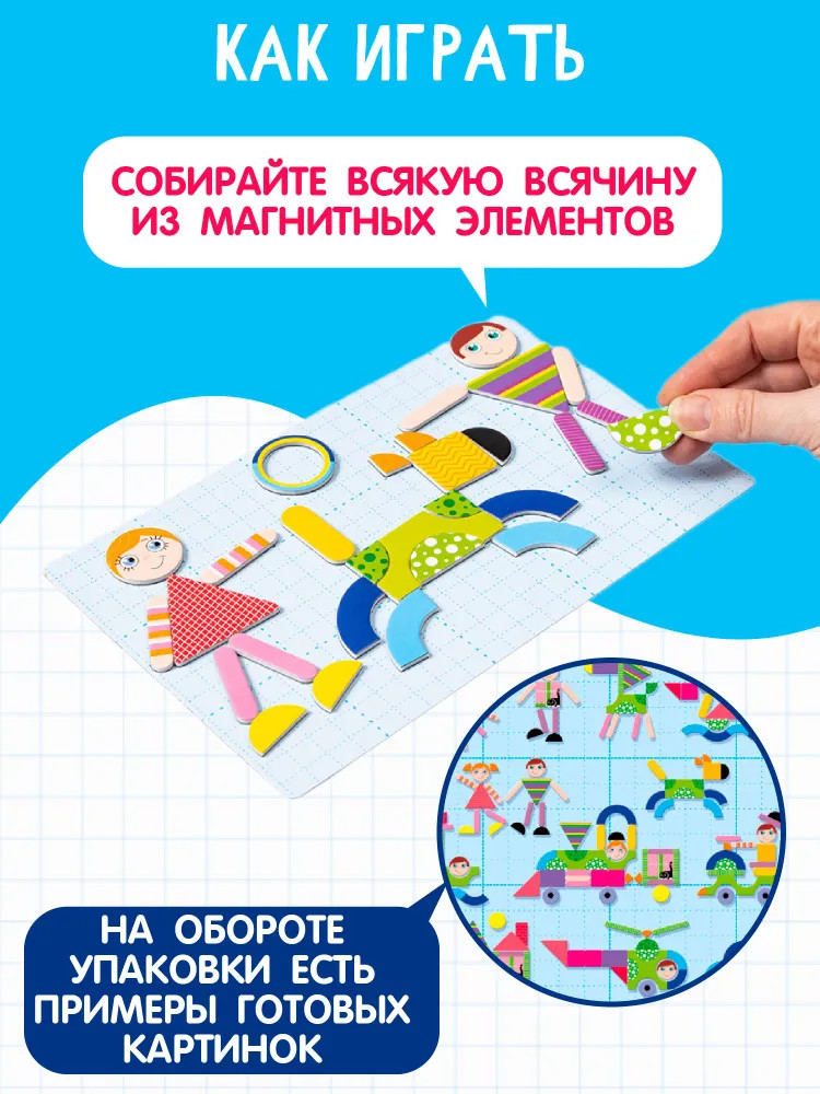 💳 Оплатить за товар можно при получении 🇰🇿 Есть бесплатная доставка по Казахстану от 1 дня 🎁 Копите бонусы с каждой покупки Мягкое магнитное поле 23,5х14,5 см бледно-голубого цвета. Поле расчерчено тонкими линиями на манер "миллиметровой" бумаги или exel-овского файла (для тех, кто не застал такую бумагу). Это сделано для того, чтобы ребенку было легче позиционировать элементы мозаики на поле. Поле выглядит как бумага, хотя к нему притягиваются магнитные элементы. Это происходит потому, что внутрь поля вклеено специальное "мягкое железо". Вместе с полем в комплект мозаики входит блок фишек и элементов, изготовленных из магнитного винила, вспененного полимера и картона. Их в комплекте 42 штуки. Они яркие, разной формы. Выглядят несколько непривычно для мозаики и очень нравятся малышам. |