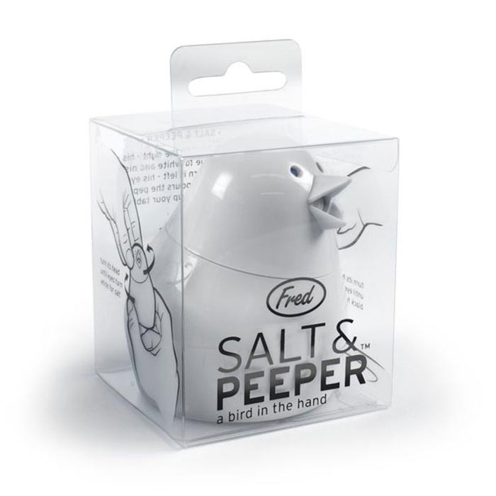 Fred&Friends Набор для соли и перца «Salt and Peeper Birdy»В данный момент этот товар отсутствует в продаже. Возможно, у нас найдется аналогичный или похожий товар здесь. Представляем Вашему вниманию креативную солонку-перечницу в виде птицы A Bird. Она не так проста, как может показаться на первый взгляд, ведь в ней объединены две специи сразу: поверните её голову направо, и её голубые глаза станут белыми (это значит, что птица переведена в режим соления), а если повернуть её голову налево - глаза изменят цвет на черный, и птица перейдет в режим перчения. |