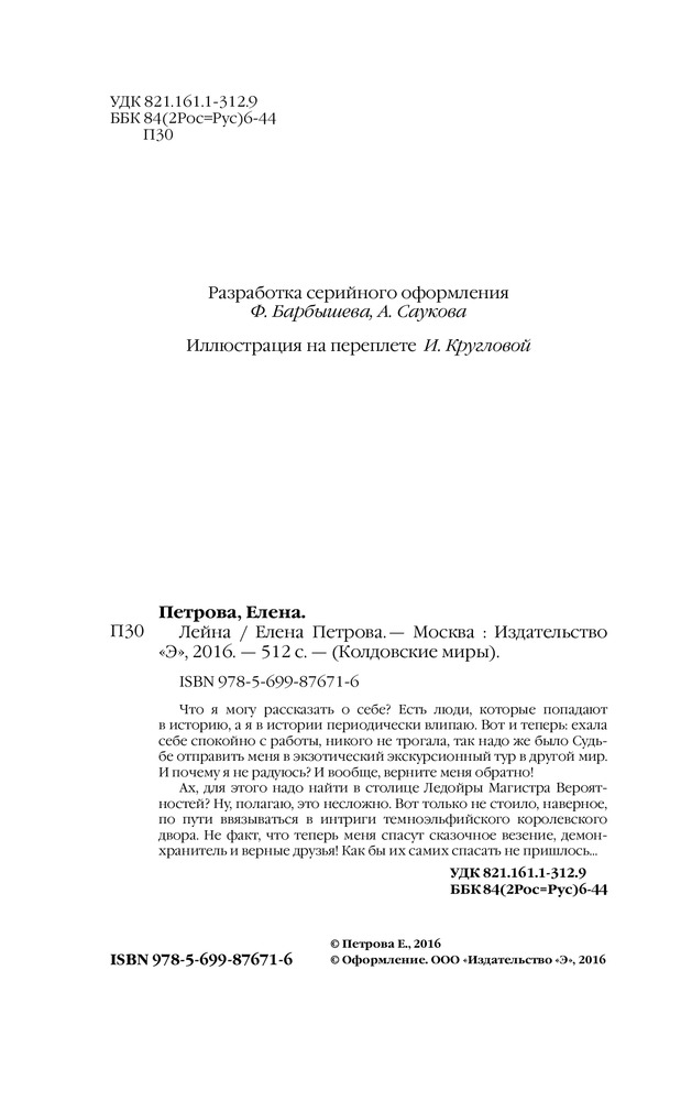 ЛейнаВ данный момент этот товар отсутствует в продаже. Возможно, у нас найдется аналогичный или похожий товар здесь. Серия: Колдовские миры Что я могу рассказать о себе? Есть люди, которые попадают в историю, а я в истории периодически влипаю. Вот и теперь: ехала себе спокойно с работы, никого не трогала, так надо же было Судьбе отправить меня в экзотический экскурсионный тур в другой мир. И почему я не радуюсь? И вообще, верните меня обратно! Ах, для этого надо найти в столице Ледойры Магистра Вероятностей? Ну, полагаю, это не сложно. Вот только не стоило, наверное, по пути ввязываться в интриги темноэльфийского королевского двора. Не факт, что теперь меня спасут сказочное везение, демон-хранитель и верные друзья! Как бы их самих спасать не пришлось. |