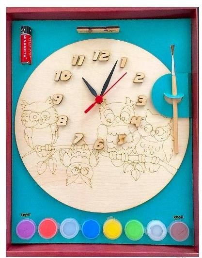 В наборе: циферблат с часовым механизмом и стрелками, акриловая гипоалергенная краска 6 баночек по 50 мл., кисточка, клей ПВА, акрилатная проникающая грунтовка, подвес для часов и батарейка.