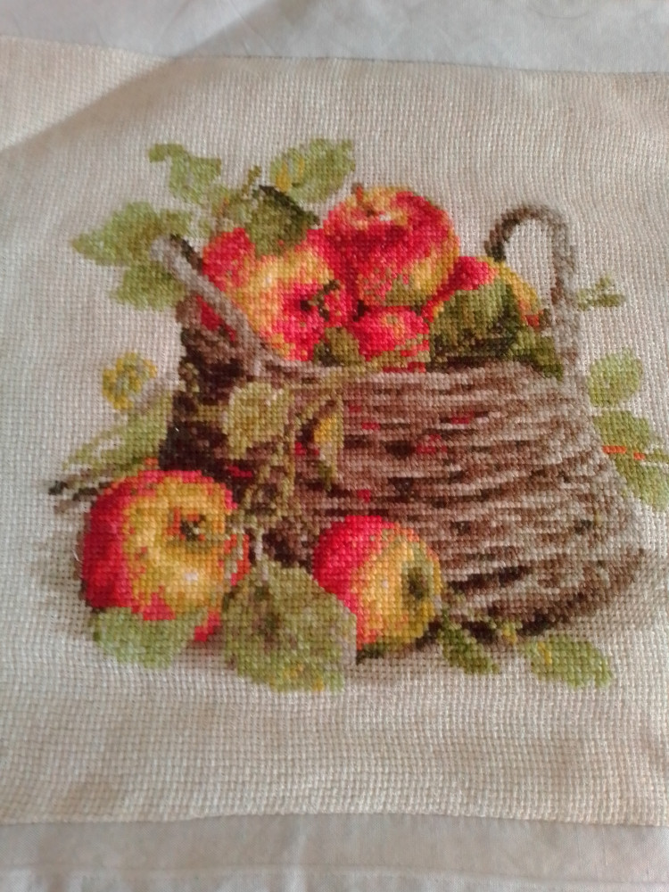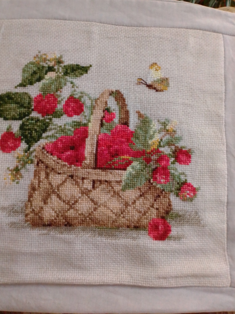 Получилась прекрасная наволочка для диванной подушки. В пару к ней вышила клубничку в лукошке