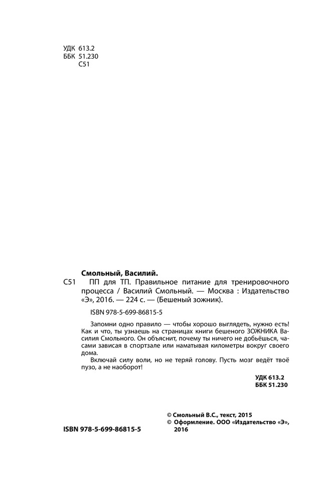 В данный момент этот товар отсутствует в продаже. Возможно, у нас найдется аналогичный или похожий товар здесь. Серия: Бешеный зожник Перед вами уникальная книга бешеного ЗОЖника Василия Смольного. Он объяснит, почему ты ничего не добьешься, часами зависая в спортзале или наматывая километры вокруг своего дома. Есть всего одно правило — чтобы хорошо выглядеть, нужно есть! Как и что, ты узнаешь на страницах этой уникальной книги!