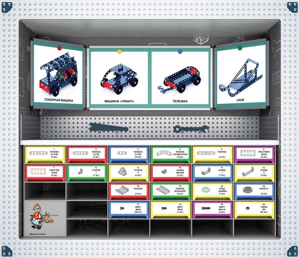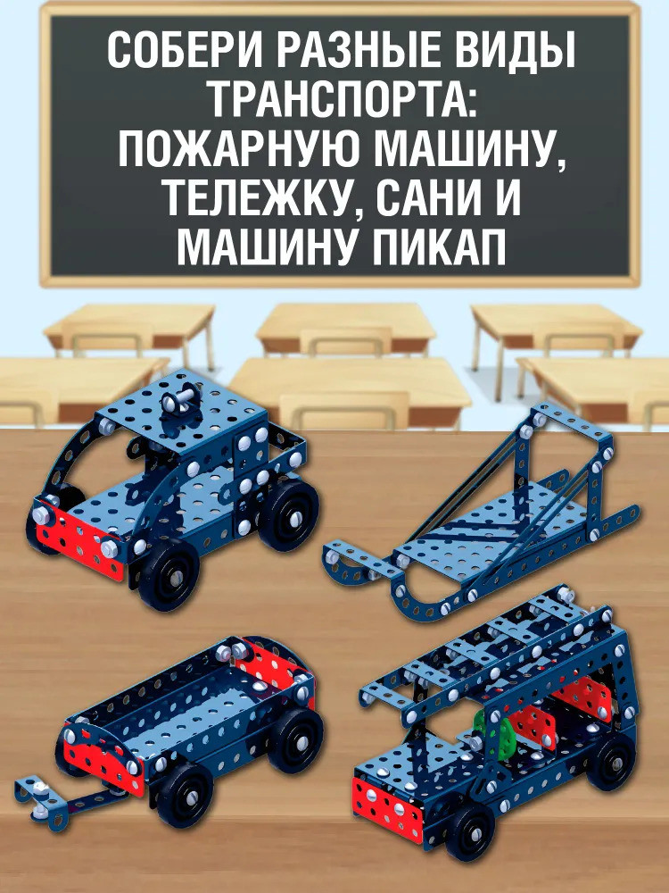 Один из новых конструкторов для уроков труда. Из 160 деталей, входящих в набор, собираются очень интересные модели. Модели, которые дают представление о различных типах транспортных средств: пожарная машина, машина «пикап», тележка, сани.