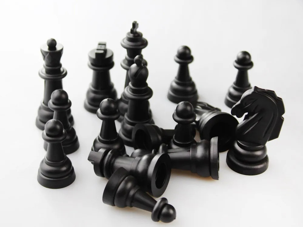 - Небольшие пластмассовые шахматные фигуры 32 шт (16 белых фигур и 16 черных), высотой от 2,5 ( пешки) до 5 см (король).