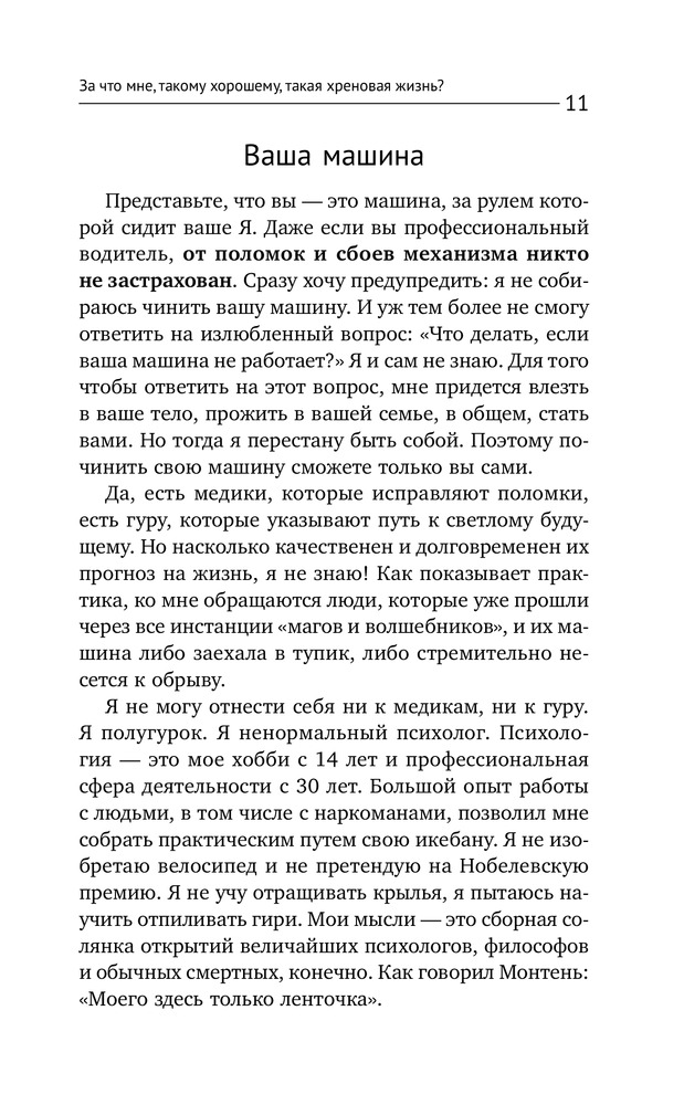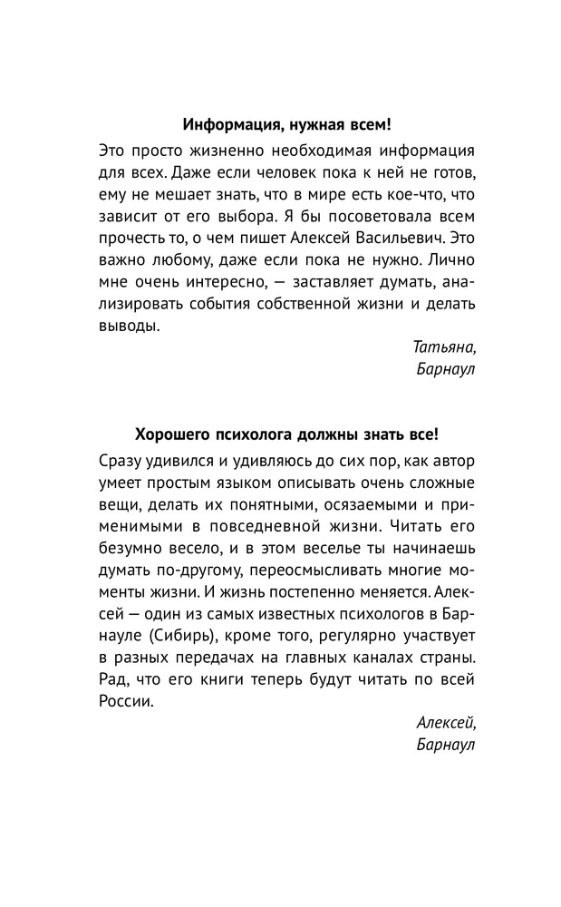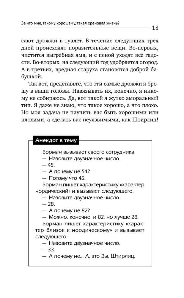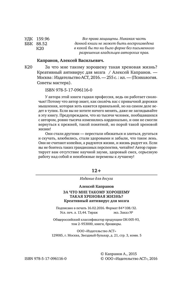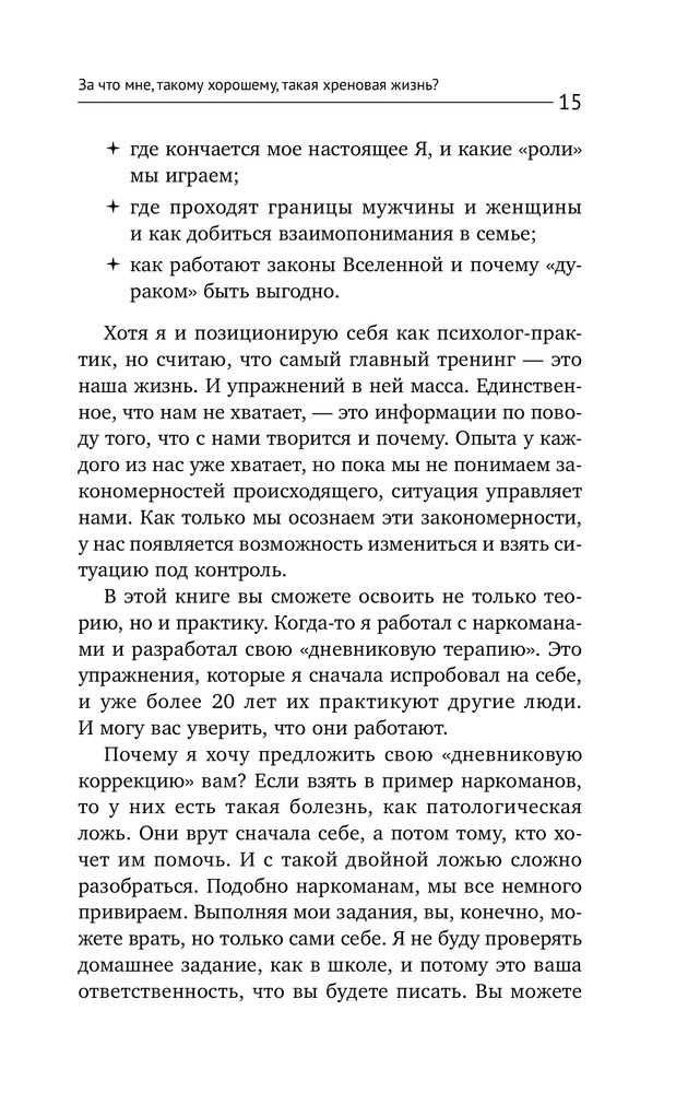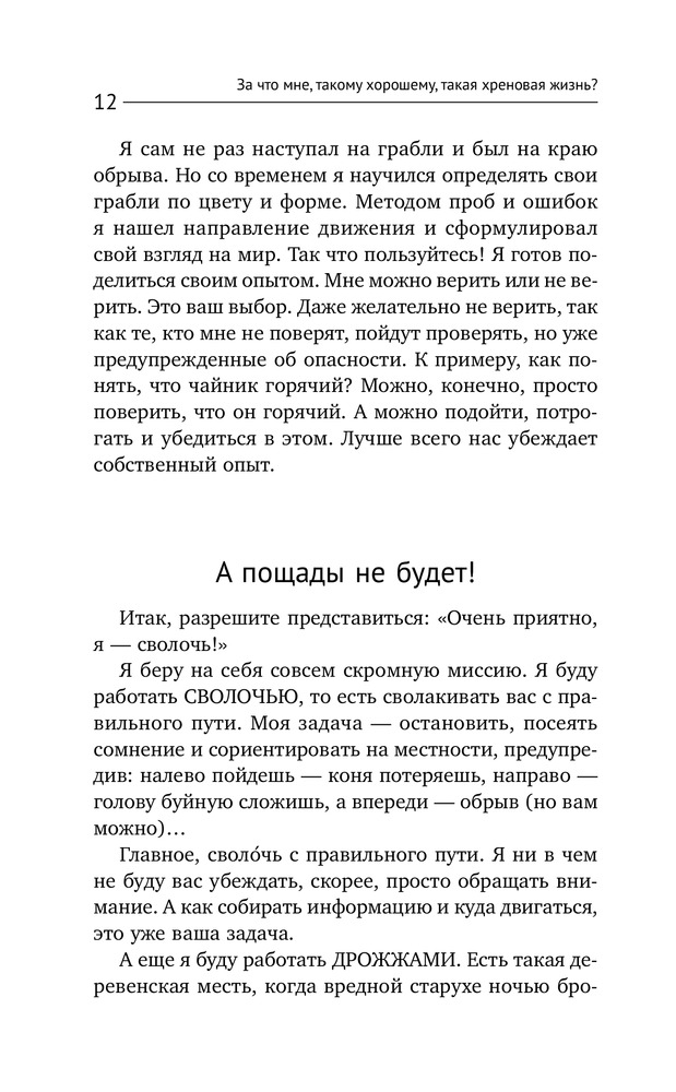 За что мне такому хорошему такая хреновая жизнь?В данный момент этот товар отсутствует в продаже. Возможно, у нас найдется аналогичный или похожий товар здесь. Серия: Психология. Советы мастера У автора этой книги гадкая профессия, ведь он работает сволочью! Потому что автор знает, как сволочь вас с привычной дорожки мышления, которая хоть кажется правильной, но на самом деле ведет в тупик. Если вы не хотите ничего менять, даже не заглядывайте в эту книгу. Предупреждаем, что из тысячи человек, пообщавшихся с автором, ровно тысяча изменились кардинально, и они не смогли вернуться к прежней, такой понятной, но порой такой хреновой жизни! |