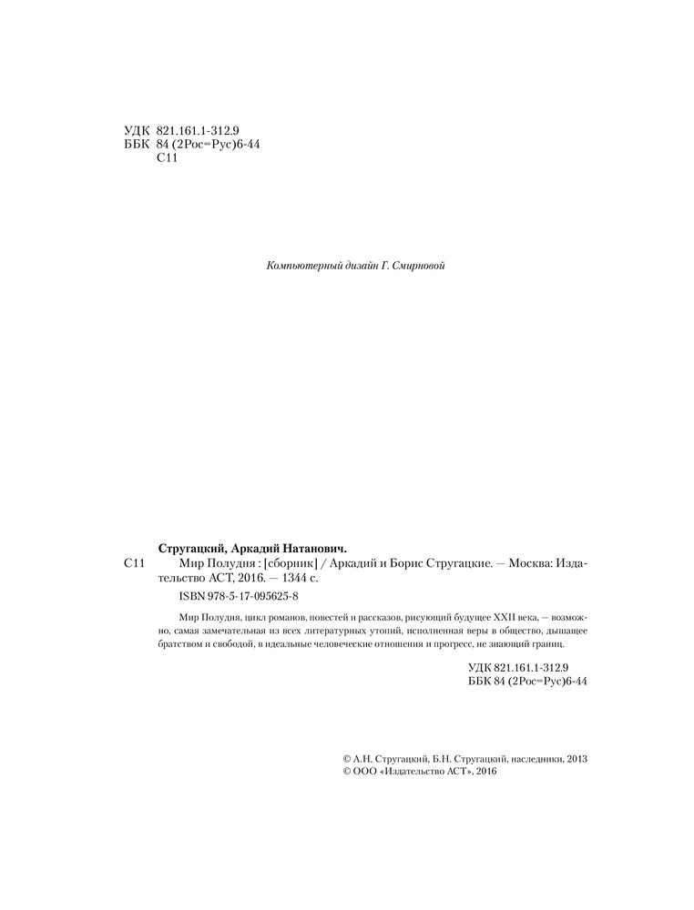 Мир ПолудняАркадий Натанович Стругацкий, Борис Натанович Стругацкий В данный момент этот товар отсутствует в продаже. Возможно, у нас найдется аналогичный или похожий товар здесь. Серия: Весь Мир Полудня, цикл романов, повестей и рассказов, рисующий будущее XXII века, — возможно, самая замечательная из всех литературных утопий, исполненная веры в общество, дышащее братством и свободой, в идеальные человеческие отношения и прогресс, не знающий границ. |