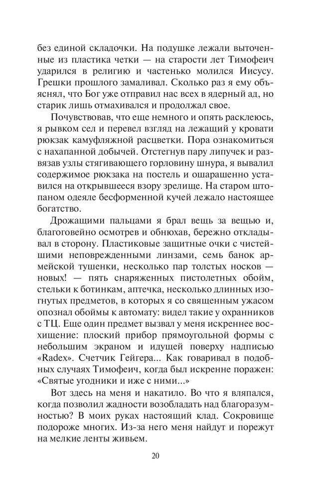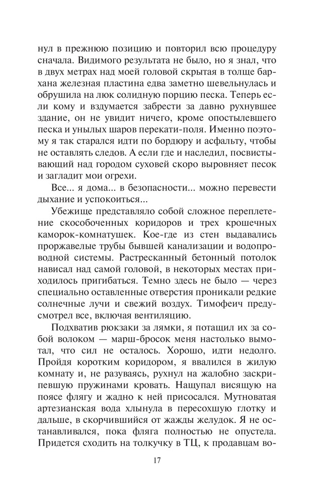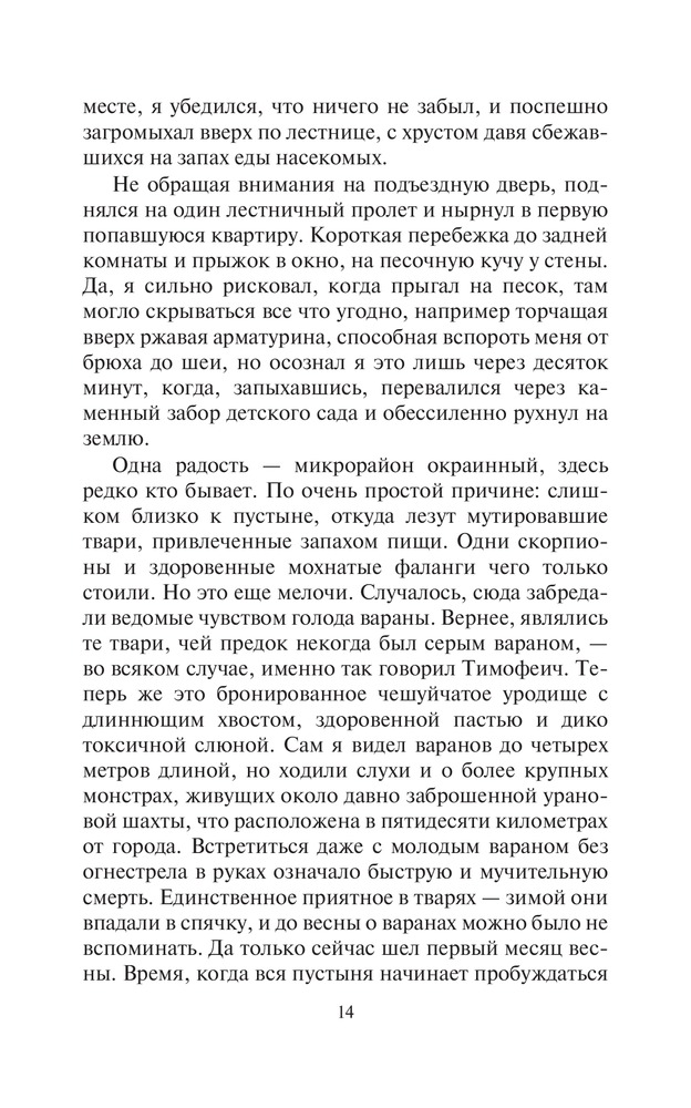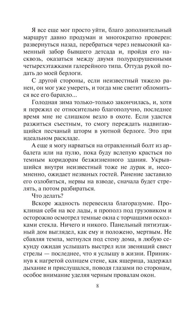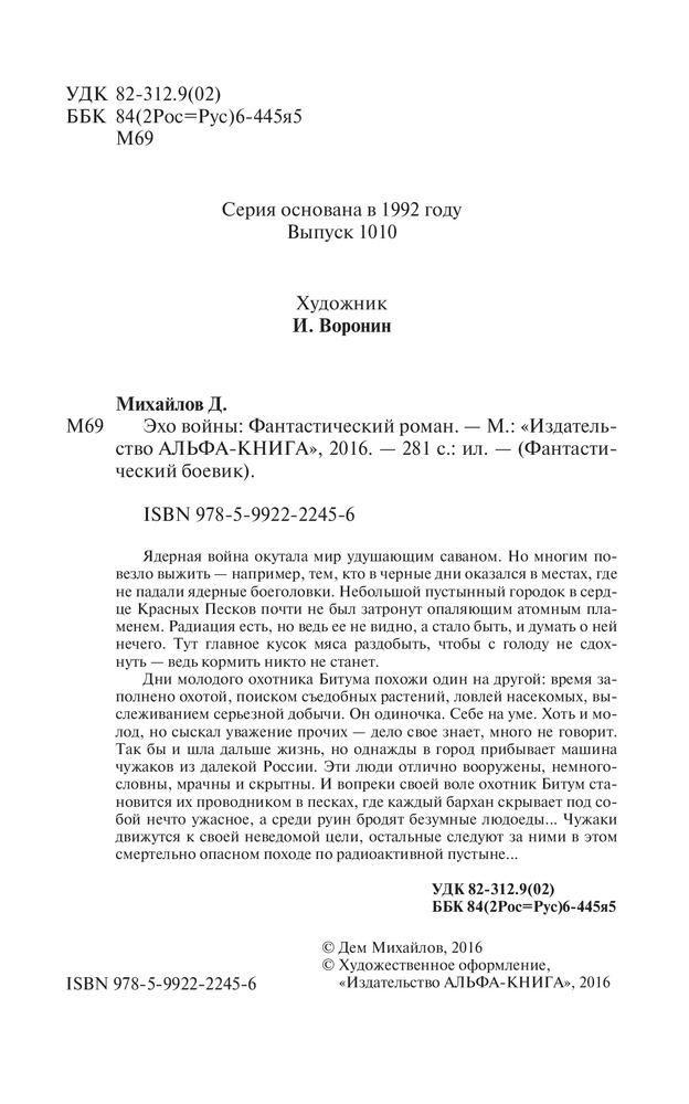 Эхо войныВ данный момент этот товар отсутствует в продаже. Возможно, у нас найдется аналогичный или похожий товар здесь. Серия: Фантастический боевик Ядерная война окутала мир удушающим саваном. Но многим повезло выжить — например, тем, кто в черные дни оказался в местах, где не падали ядерные боеголовки. Небольшой пустынный городок в сердце Красных Песков почти не был затронут опаляющим атомным пламенем. Радиация есть, но ведь ее не видно, а стало быть, и думать о ней нечего. Тут главное кусок мяса раздобыть, чтобы с голоду не сдохнуть — ведь кормить никто не станет. |