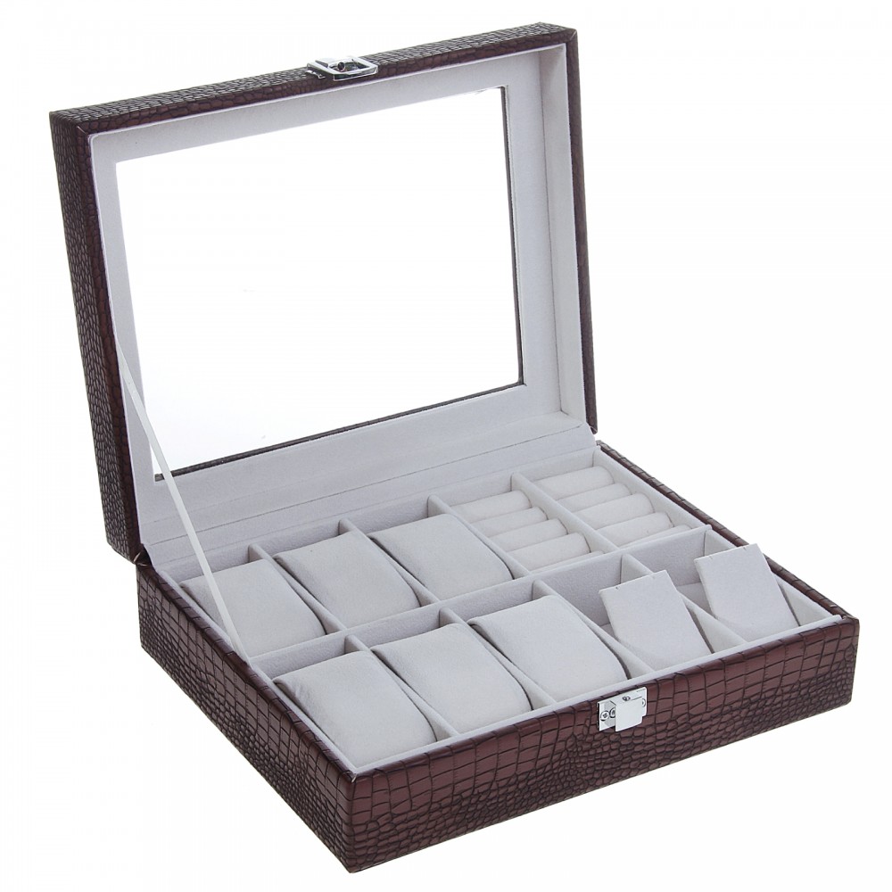 Шкатулка под часы 6 отделений и бижутерию «Кофейный питон»В данный момент этот товар отсутствует в продаже. Возможно, у нас найдется аналогичный или похожий товар здесь. Шкатулка для бижутерии и часов – настоящая находка для женщины, которая привыкла всегда выглядеть безупречно и подчеркивать свое очарование эффектными аксессуарами. Классически элегантная снаружи, эта шкатулка оказывается очень удобной и вместительной внутри. Она снабжена отделениями, предназначенными для разных украшений: колец, браслетов, часов, колье, цепочек, серег. Изящная и аккуратная, шкатулка изготовлена из дерева, изнутри покрыта мягким и бархатистым материалом, а снаружи – эффектной искусственной кожей. |