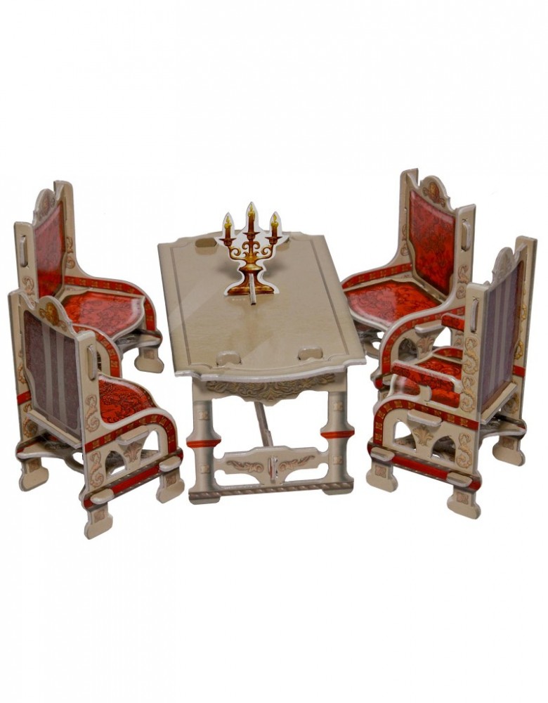 Серия: Коллекционный набор мебели Мебель доступна в двух вариантах - в светлом и темном исполнении. В комплект, кроме обеденного стола, входят три стула и кресло. Кресло отличается высокой спинкой. Интересное дополнение - подсвечник. В наборе есть все для самостоятельной сборки столовой. Нет необходимости при подготовке вырезать детали. Детали соединяются друг с другом без клея. После сборки набор можно использовать для игры. Конструкция достаточно прочна и стабильна. Набор отличается простой и понятной сборкой. Его можно смело рекомендовать детям, которые не имеют опыта сборки наших игрушек.  |