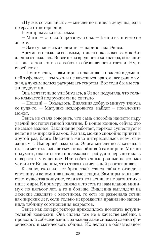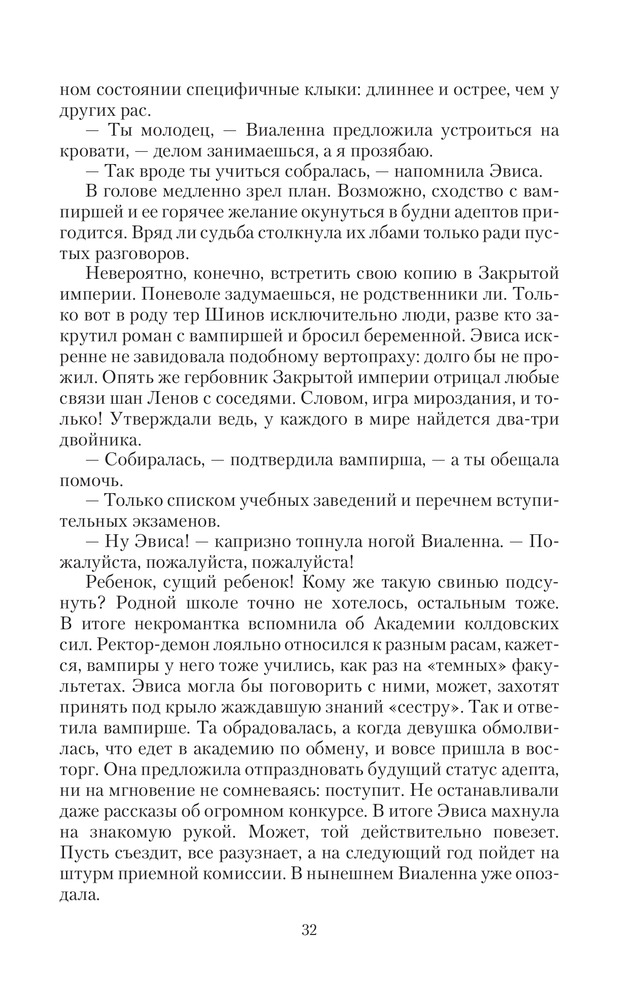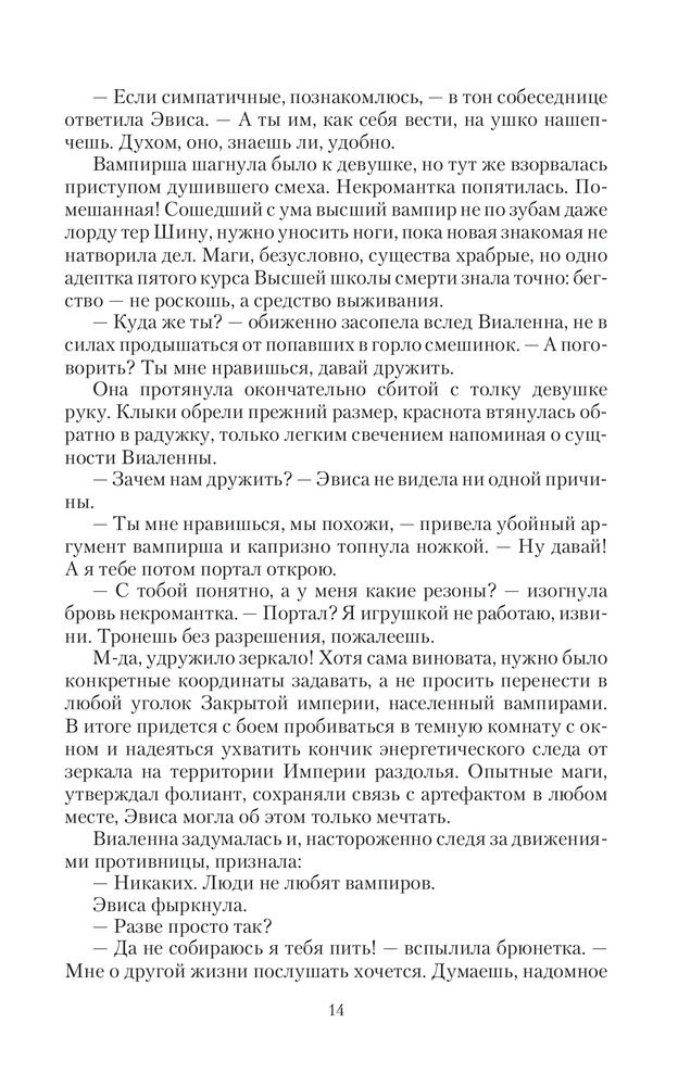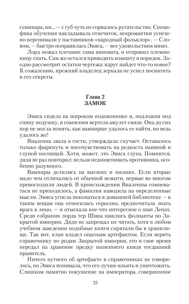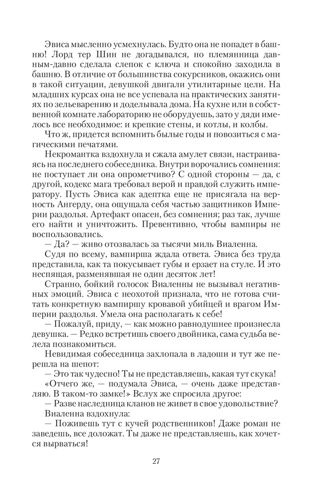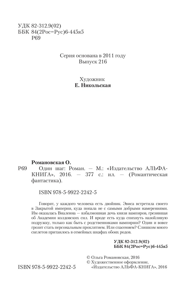 Один шагВ данный момент этот товар отсутствует в продаже. Возможно, у нас найдется аналогичный или похожий товар здесь. Серия: Романтическая фантастика Говорят, у каждого человека есть двойник. Эвиса встретила своего в Закрытой империи, куда попала не с самыми добрыми намерениями. Им оказалась Виаленна — взбалмошная дочь князя вампиров, грезившая об Академии колдовских сил. И вроде есть куда спихнуть назойливую подружку, только как быть с родственниками вампирши? Один и вовсе грозит стать персональным проклятием. Или спасением? Слишком много скелетов притаилось в семейных шкафах обоих родов. |