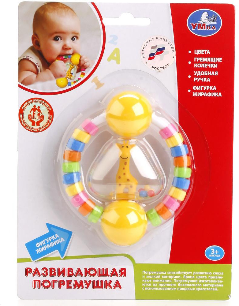 УМка Погремушка «Жирафик»В данный момент этот товар отсутствует в продаже. Возможно, у нас найдется аналогичный или похожий товар здесь. Погремушка с цветными колечками — это яркая игрушка, которая станет важнейшей на ранних этапах развития малыша. Она изготовлена из пластика ярких цветов в виде кольца, в центре которого установлен маленький жираф. Внутри находятся небольшие шарики. Если слегка потрясти игрушку, то она начнёт греметь. По всему кольцу прикреплены цветные рельефные бусины, которые выполняют функцию прорезывателя. |