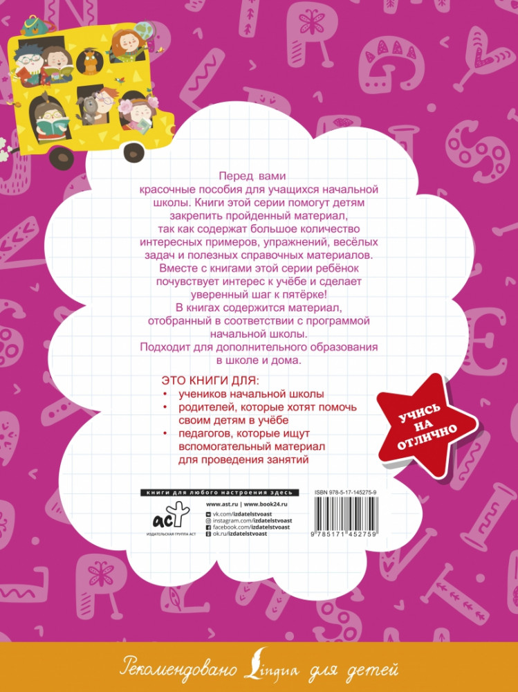 💳 Оплатить за товар можно при получении 🇰🇿 Есть бесплатная доставка по Казахстану от 1 дня 🎁 Копите бонусы с каждой покупки Серия: 5 ступеней к пятёрке В книгу вошли все основные правила английского языка, изучаемые в начальной школе: «Транскрипция. Произношение», «Имя существительное», «Время глагола», «Построение предложений» и другие. К каждому правилу даны примеры, что помогает в процессе изучения английского языка. |