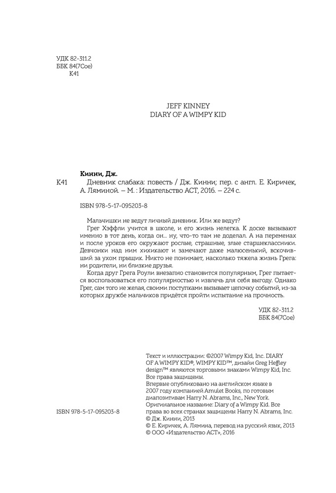 Отвратительная книга, некий американский фаст фуд.Я купила и не заметила,как сын ее прочитал за день, потом вечером открыла и увидела это безобразие с нелитературной лексикой и ничему хорошему не учащими историями.Мне стыдно за свою покупку и что ребенок это прочел.Я сама педагог и не советую такое детям,а восторженные отзывы меня пугают,хоть они меня и подкупили первоначально. Покупайте детям классику,добрую и воспитывающую хороших людей.