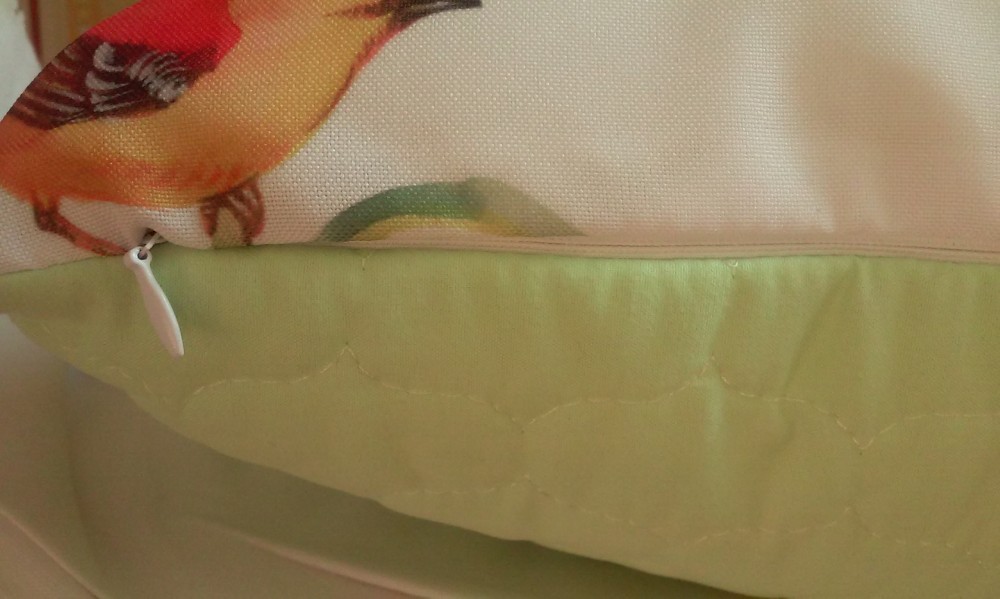 Подушечка очень мягкая, упругая. Наполнитель находится во флезелиновой оболочке. Наволочка двусторонняя. С одной стороны ткань стёганая, однотонная, приятная на ощупь. С другой (лицевой) стороны, типа габардин с нанесённым принтом " а ля батик". Замочек - молния, потайной, при пользовании подушкой дискомфорт не вызывает. Покупкой очень довольна.