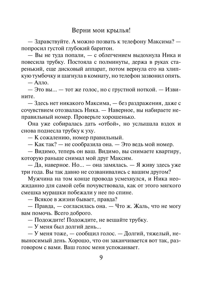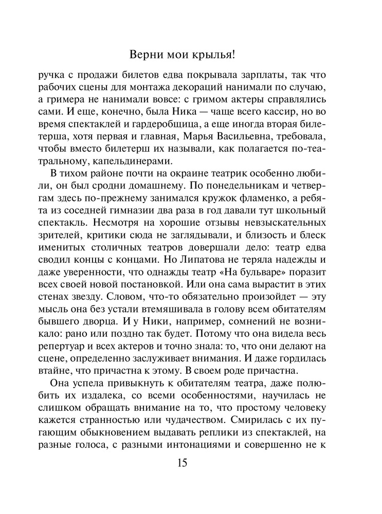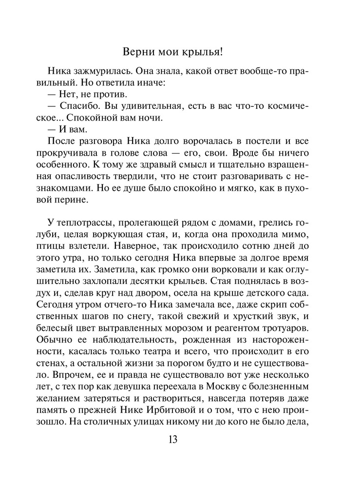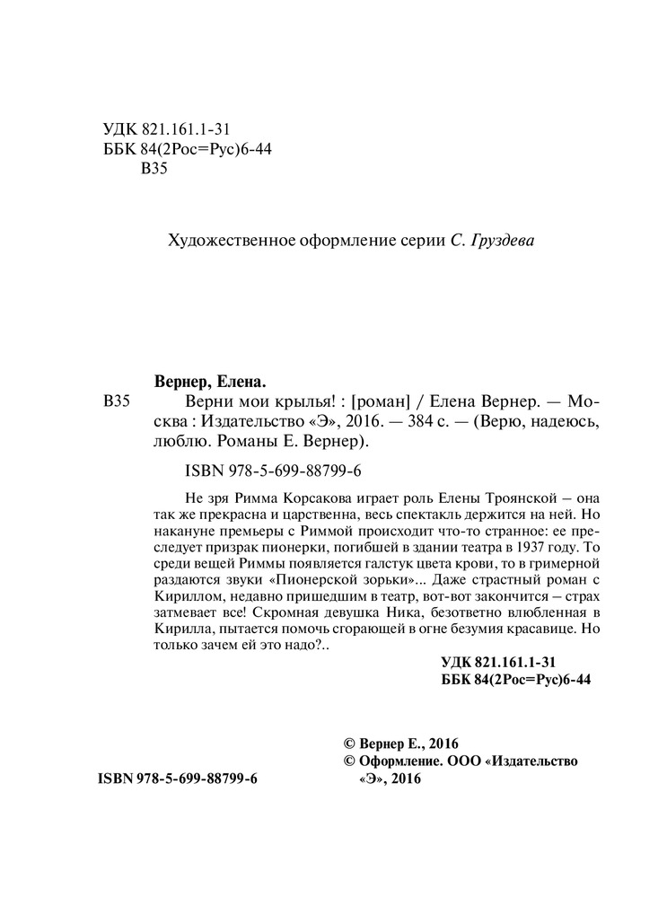 Верни мои крылья!В данный момент этот товар отсутствует в продаже. Возможно, у нас найдется аналогичный или похожий товар здесь. Серия: Верю, надеюсь, люблю. Романы Е. Вернер (обложка) Не зря Римма Корсакова играет роль Елены Троянской — она так же прекрасна и царственна, весь спектакль держится на ней. Но накануне премьеры с Риммой происходит что-то странное: ее преследует призрак пионерки, погибшей в здании театра в 1937 году. То среди вещей Риммы появляется галстук цвета крови, то в гримерной раздаются звуки «Пионерской зорьки». Даже страстный роман с Кириллом, недавно пришедшим в театр, вот-вот закончится — страх затмевает все! Скромная девушка Ника, безответно влюбленная в Кирилла, пытается помочь сгорающей в огне безумия красавице. Но только зачем ей это надо? |