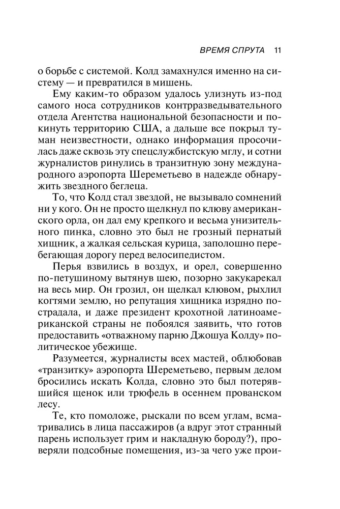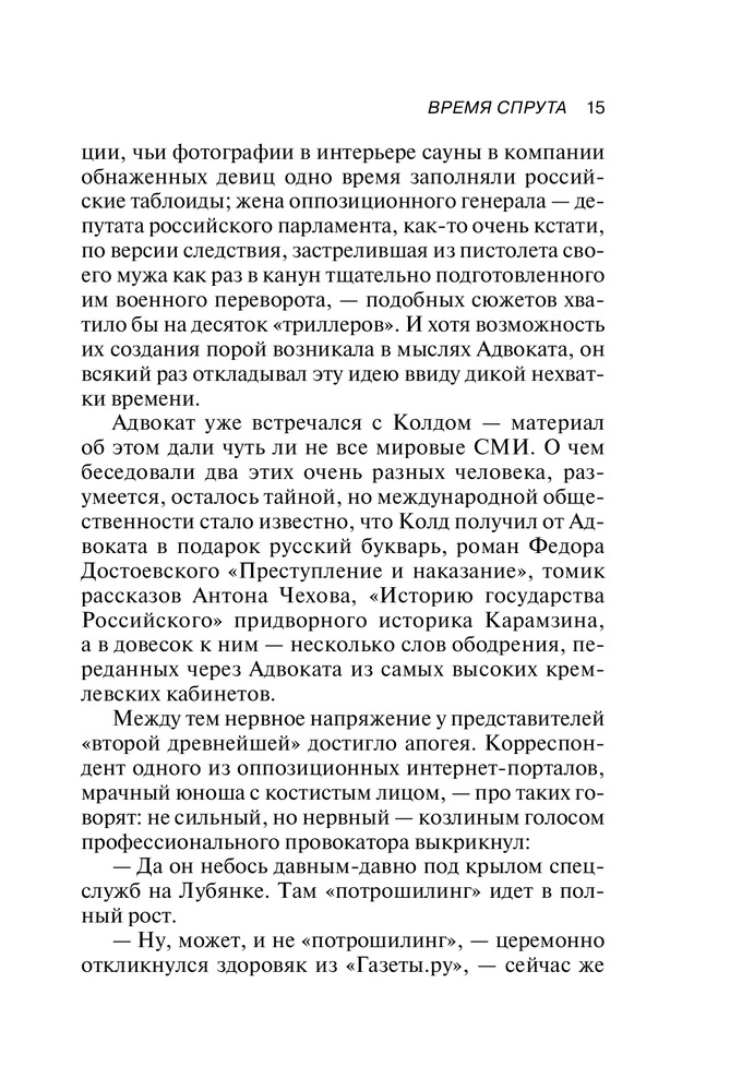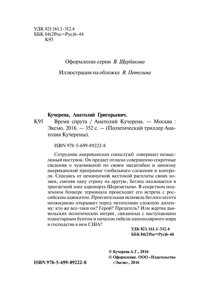 Время спрутаВ данный момент этот товар отсутствует в продаже. Возможно, у нас найдется аналогичный или похожий товар здесь. Серия: Политический триллер Анатолия Кучерены Сотрудник американских спецслужб совершает немыслимый поступок. Он предает огласке совершенно секретные сведения о чудовищной по своим масштабам и цинизму американской программе глобального слежения и контроля. Спасаясь от неминуемой жестокой расплаты своих хозяев, сменяя одну страну на другую, беглец оказывается в транзитной зоне аэропорта Шереметьево. В секретном подземном бункере терминала происходит его встреча с российским Адвокатом. Пронзительная исповедь беглого агента неожиданно открывает перед читателями сложную дилемму: кто же все-таки он? Герой? Предатель? Или жертва дьявольских политических интриг, связанных с наступающим планетарным бунтом и началом гибели однополярного мира и господства в нем США? |
