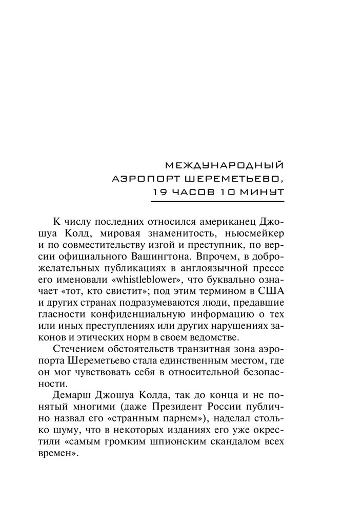 Довольно интересная подача произведения - отчёт одного информативного вечера с временными метками. Улыбнуло примечание в начале о том, что сюжет и главные герои являются выдумкой и любые совпадения случайны) Сноуден весьма интересный человек. И то, что он сделал такой отчаянный поступок, делает его не столь героем современности, сколь настоящим борцом за справедливость.