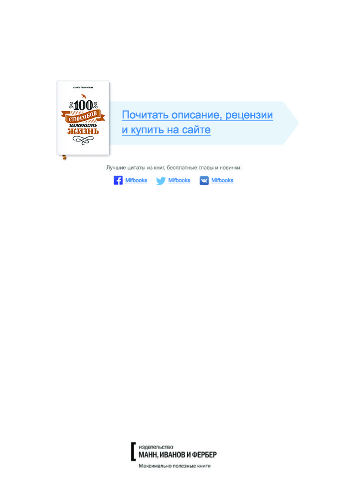 Чтобы получать что-то полезное от книг, нужно читать их по сто и по двести и более. Если прочесть одну книгу и написать что она не оправдала ожиданий, про эту книгу такое не скажешь. Из этой книги для себя я узнала что на правильном пути. Кроме того, есть ссылки на книги которые можно прочитать в будущем. Жалко что бизнес-книги стоят дороже художественно литературы, и их нельзя брать в городской библиотеке, кроме того их не скачаешь ниоткуда в сети. Тут на помощь приходит Флип, со скидками и дисконтами. 100 способов изменить жизнь - для слабеньких духом, но находящихся наверном пути, очень хорошая книга, для средних успешных людей - подтверждение что ты на верном пути.