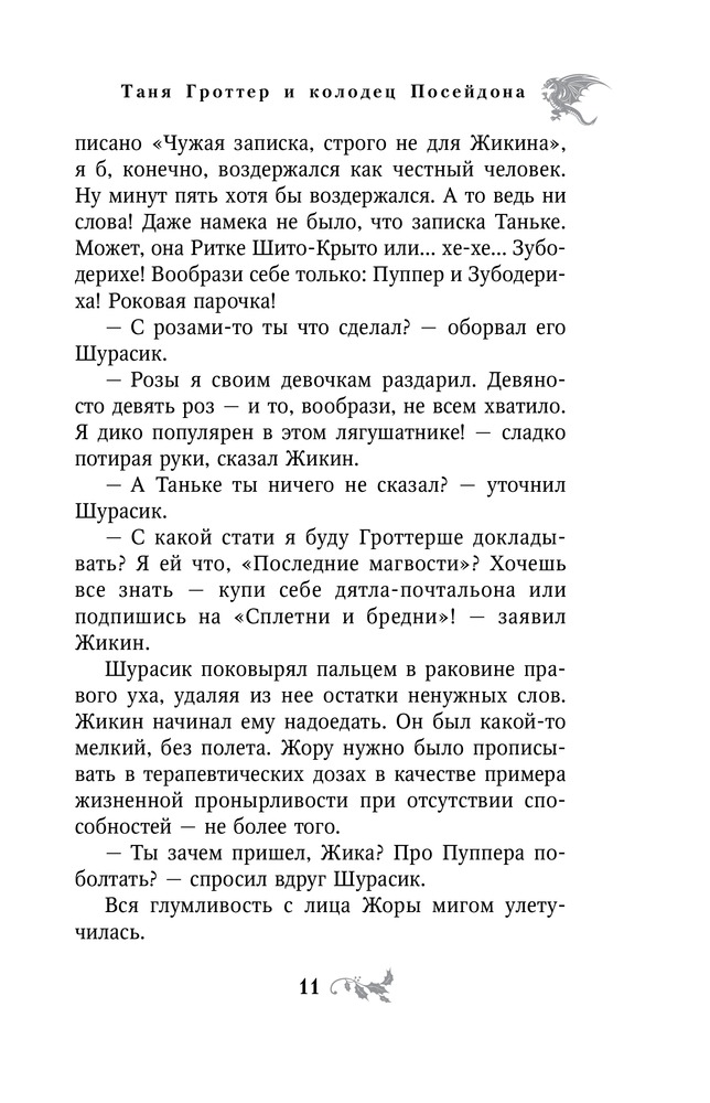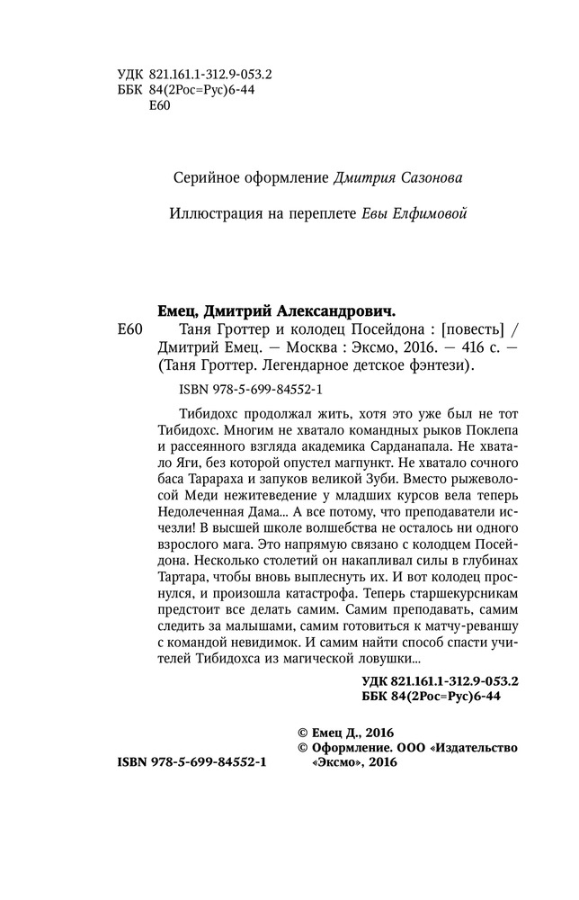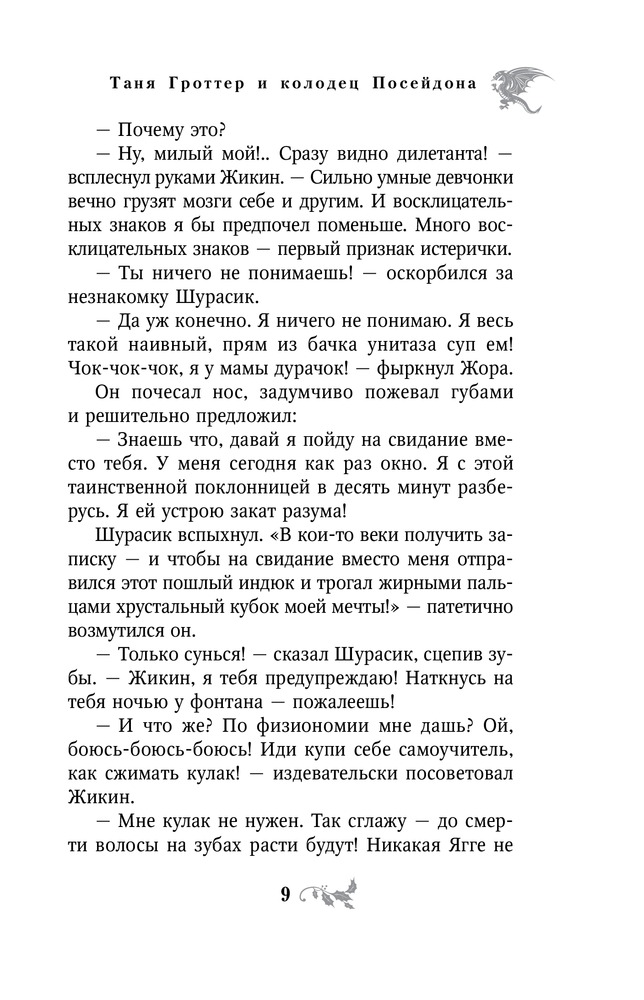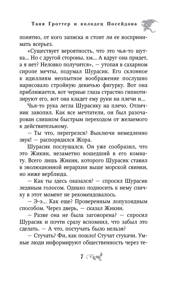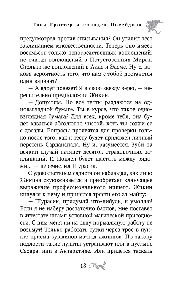 Таня Гроттер и колодец ПосейдонаВ данный момент этот товар отсутствует в продаже. Возможно, у нас найдется аналогичный или похожий товар здесь. Серия: Таня Гроттер. Легендарное детское фэнтези Тибидохс продолжал жить, хотя это уже был не тот Тибидохс. Многим не хватало командных рыков Поклепа и рассеянного взгляда академика Сарданапала. Не хватало Яги, без которой опустел магпункт. Не хватало сочного баса Тарараха и запуков великой Зуби. Вместо рыжеволосой Меди нежитеведение у младших курсов вела теперь Недолеченная Дама... А все потому, что преподаватели исчезли! В высшей школе волшебства не осталось ни одного взрослого мага. Это напрямую связано с колодцем Посейдона. Несколько столетий он накапливал силы в глубинах Тартара, чтобы вновь выплеснуть их. И вот колодец проснулся, и произошла катастрофа. Теперь старшекурсникам предстоит все делать самим. Самим преподавать, самим следить за малышами, самим готовиться к матчу-реваншу с командой невидимок. И самим найти способ спасти учителей Тибидохса из магической ловушки... |