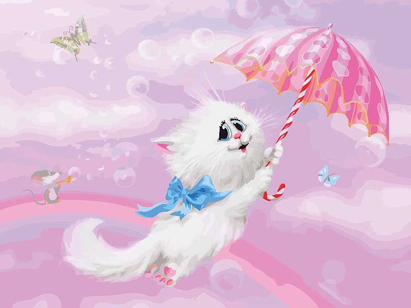Картинка в целом очень эффектная, но кошечка почему-то получилась не белой, а почти серой. Краски свежие - это плюс. Не рекомендую начинающим "художникам", т. к. тона пастельные и видны все огрехи.