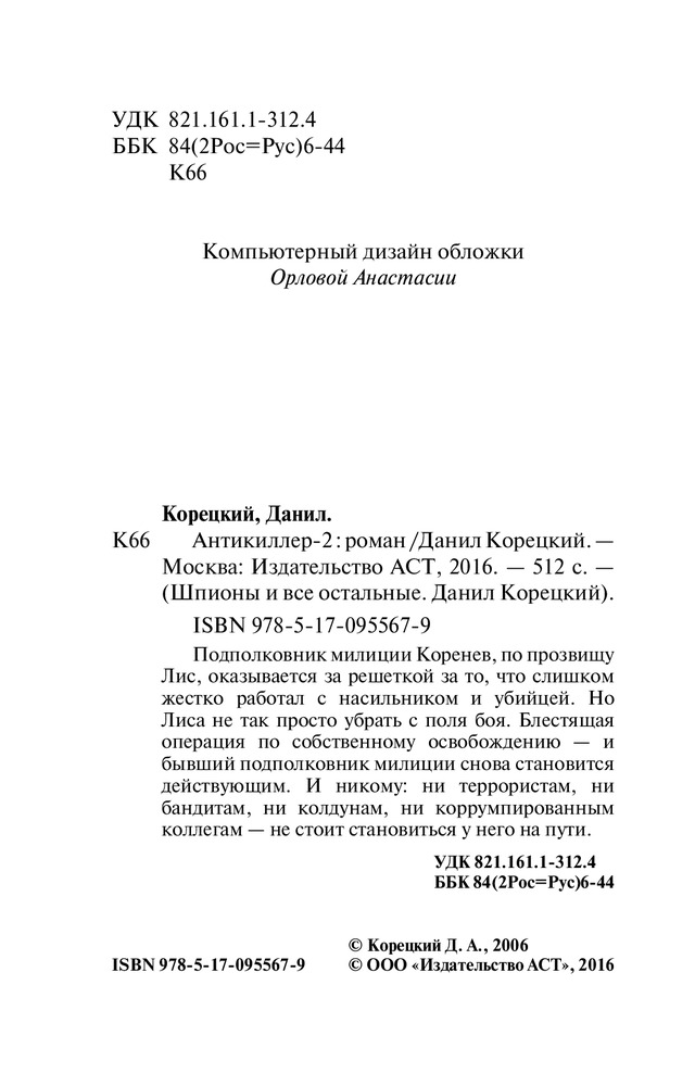 В данный момент этот товар отсутствует в продаже. Возможно, у нас найдется аналогичный или похожий товар здесь. Серия: Шпионы и все остальные. Данил Корецкий Подполковник милиции Коренев, по прозвищу Лис, оказывается за решеткой за то, что слишком жестко работал с насильником и убийцей. Но Лиса не так просто убрать с поля боя. Блестящая операция по собственному освобождению — и бывший подполковник милиции снова становится действующим. И никому: ни террористам, ни бандитам, ни колдунам, ни коррумпированным коллегам — не стоит становиться у него на пути.