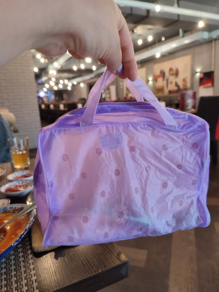Сумочка легкая, непромокаемая, замочек работает хорошо. Размер хороший. Мягкая, тонкая, но вроде достаточно прочная.