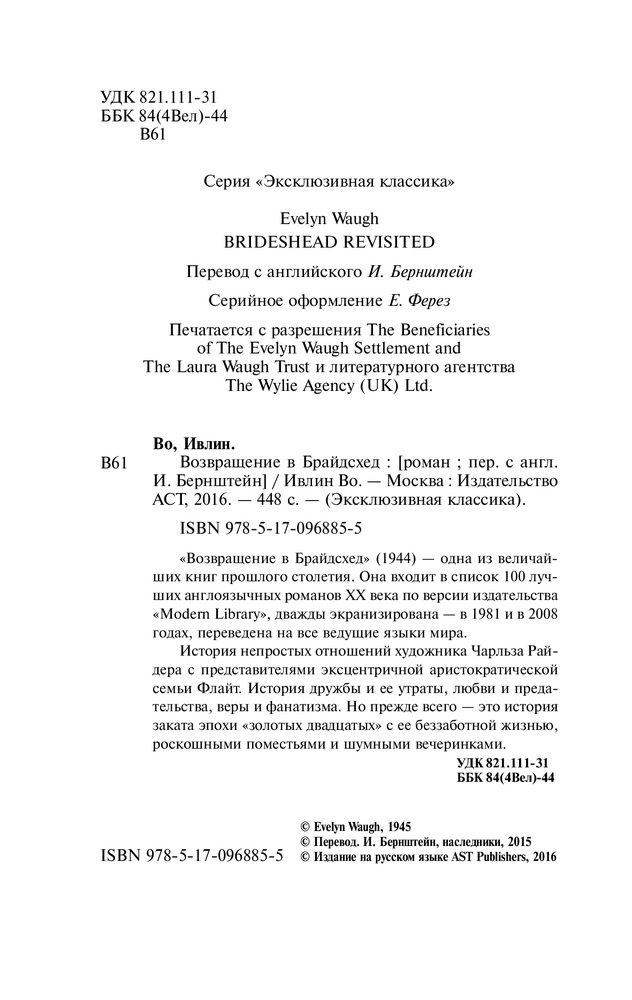Возвращение в БрайдсхедВ данный момент этот товар отсутствует в продаже. Возможно, у нас найдется аналогичный или похожий товар здесь. Серия: Эксклюзивная классика «Возвращение в Брайдсхед» (1944) — одна из величайших книг прошлого столетия. Она входит в список «100 лучших англоязычных романов ХХ века» по версии издательства «Modern Library», дважды экранизирована — в 1981 и в 2008 годах, переведена на все ведущие языки мира. |