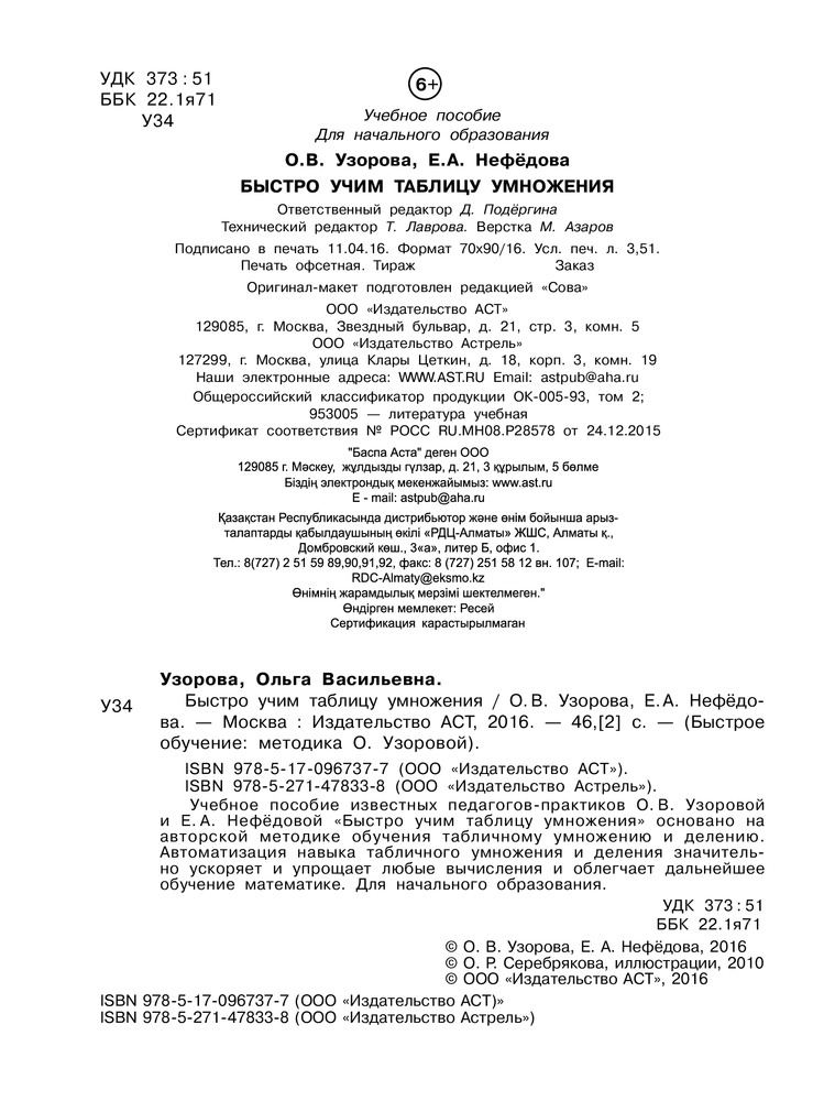 💳 Оплатить за товар можно при получении 🇰🇿 Есть бесплатная доставка по Казахстану от 1 дня 🎁 Копите бонусы с каждой покупки Серия: Быстрое обучение: методика О. В. Узоровой Учебное пособие известных педагогов-практиков О.В. Узоровой и Е.А. Нефёдовой «Быстро учим таблицу умножения» основано на авторской методике обучения табличному умножению и делению. Ежедневные занятия по этой методике позволят эффективно организовать процесс запоминания и помогут вашему ребёнку выучить таблицу умножения и деления. |