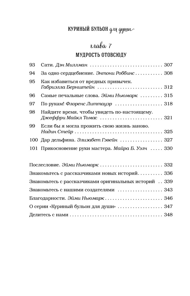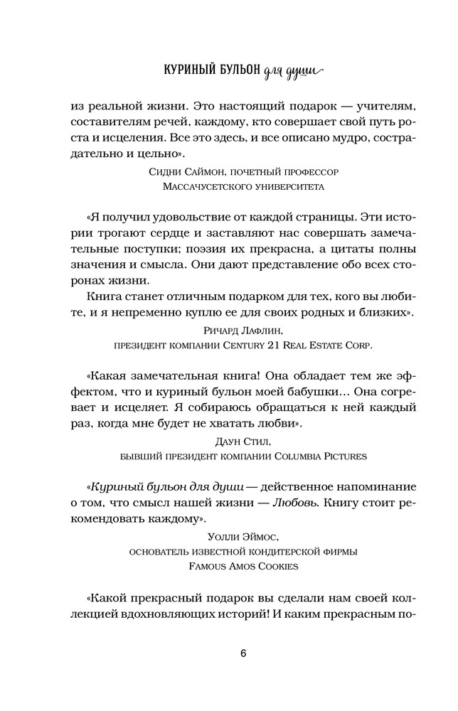 Замечательная серия книг "Куринный бульон"! Скупила почти все! Душевные, чувственные рассказы, вдохновляющие на добрые поступки, мотивируют. Спасибо большое авторам и магазину Flip! Здоровья всем и благополучия!