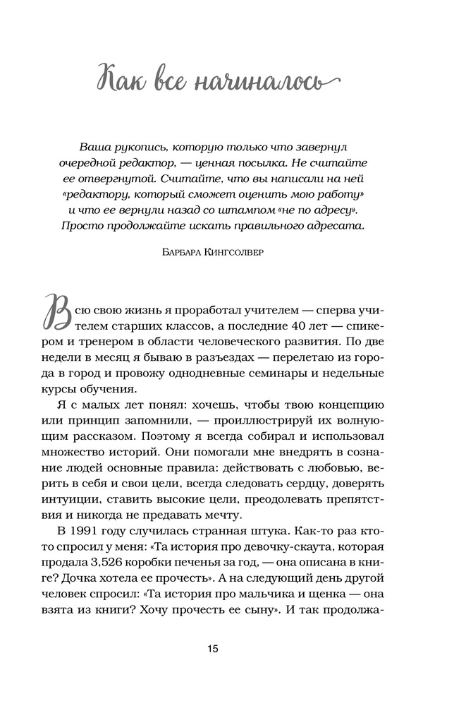 Книгу приятно держать в руках, хорошая бумага, красивое оформление. Купила её, опираясь на отзывы. И, прочитав, честно говоря не понимаю такого бурного восторга. Покупала её, надеясь почитать именно добрые рассказы, как и написано на обложке, но таковых оказалось всего несколько. В целом же, все рассказы направлены на мотивацию и получилась ещё одна из многих книг-мотиваторов в американском стиле. Лучше бы купила какую-нибудь другую книгу.