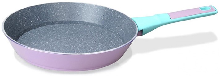Выглядит симпатишно. Пока новая. Все это синенькое и розовенькое очень быстро пачкается и очень трудно чистится. Но главный минус не это. Примерно через полгода, может и раньше, использования поверхность в центре вспучилась. Не сильно и если не приглядываться то незаметно. Зато отлично чувствуется, когда что-то жарится в масле. Получается по центру круг около 5 см – сухая сковорода и там все пригорает, а по краям жарится в масле. Отстой. Использовалась на газу и на индукционной плите. Ручка на газу пригорает. За 2,5 года использования не один раз покрывалась темным нагаром, который счищался металлической сеткой и можно было пользоваться. В этот раз не помогло и сковорода на помойку. Второй раз такую брать желания нет.