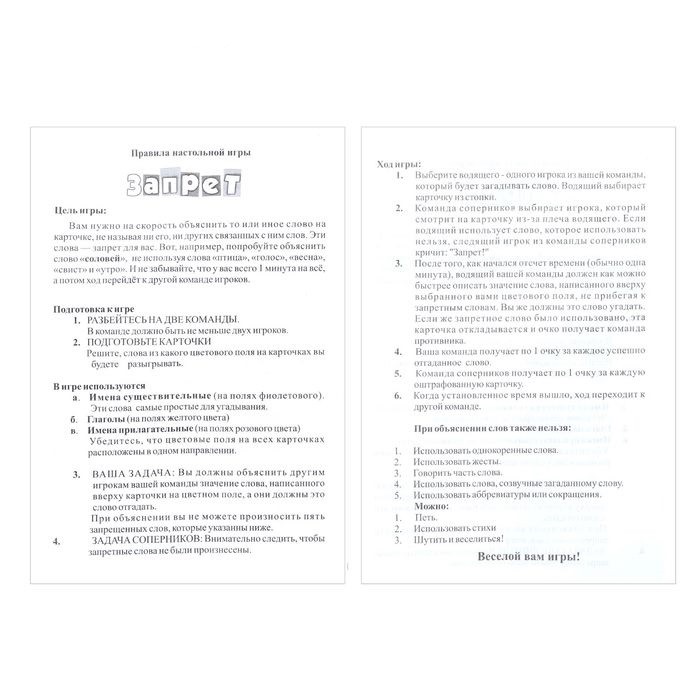 Задира-плюс Карточная игра «Запрет»В данный момент этот товар отсутствует в продаже. Возможно, у нас найдется аналогичный или похожий товар здесь. Эта увлекательная игра сможет разнообразить любую встречу друзей, наполнит ее весельем, смехом и проверит ваш словарный запас! В «Запрет» можно играть где угодно - дома, во время перерыва на работе, в поезде и во многих других местах, где собирается компания, желающая поразвлечься! Угадай как можно больше слов за минуту, чтобы победить. |