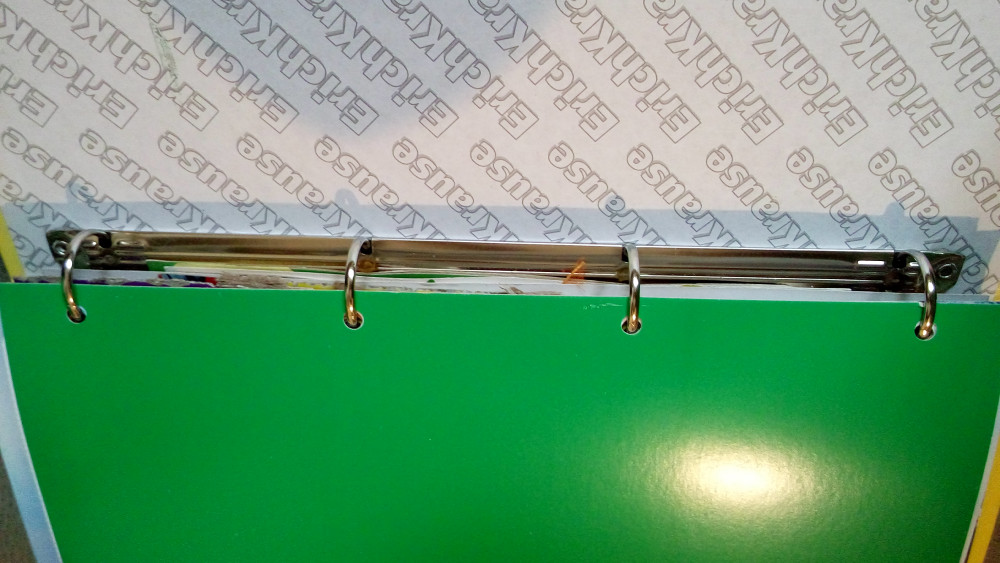 Классная папка из твердого картона, с 4 маленькими кольцами. В комплекте не идут файлы, их докупать отдельно. Видно, что прослужит долго