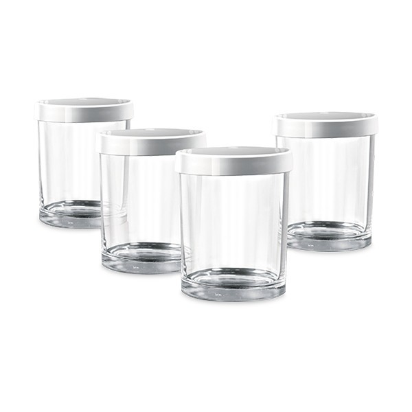 Комплект включает 4 стеклянные баночки объемом 180 мл каждая. Крышки баночек снабжены удобным дисковым маркером, позволяющим зафиксировать дату приготовления йогурта.