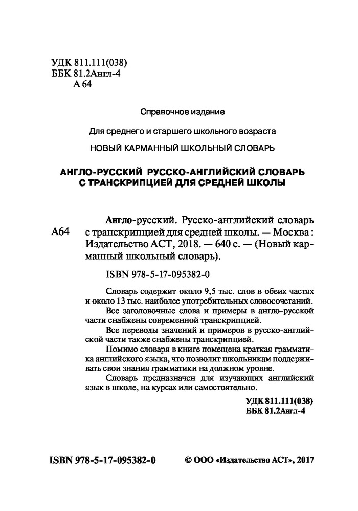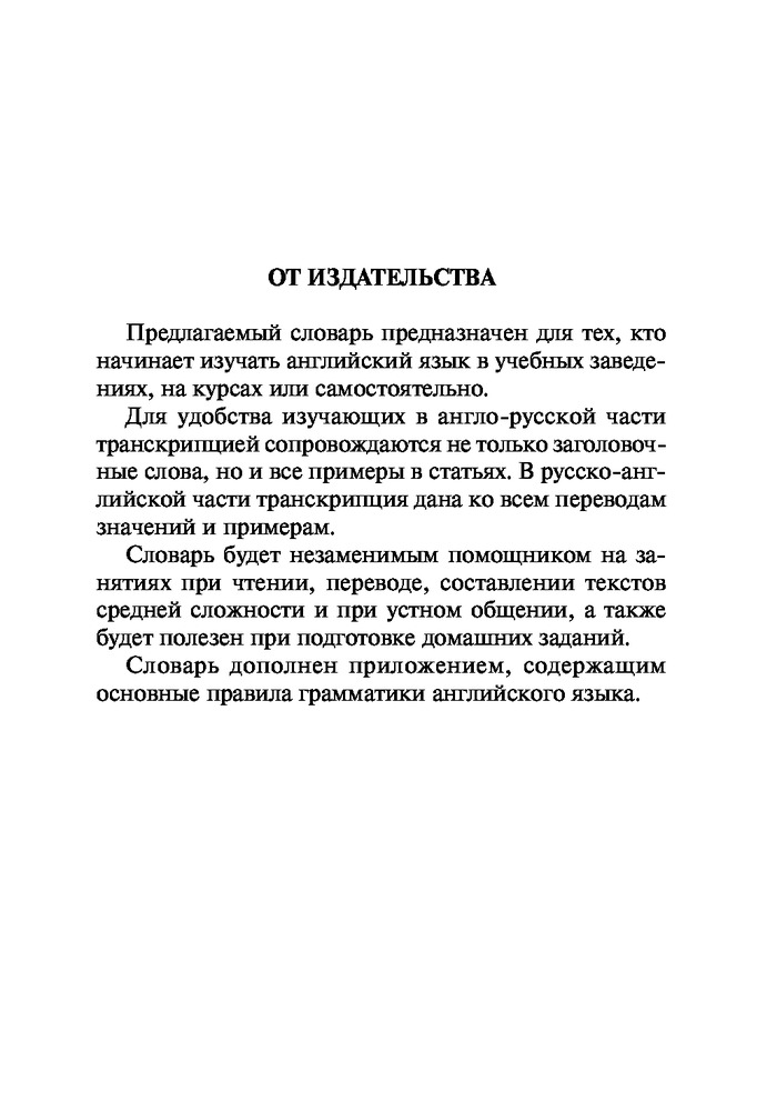 Англо-русский. Русско-английский словарь с транскрипцией для средней школыВ данный момент этот товар отсутствует в продаже. Возможно, у нас найдется аналогичный или похожий товар здесь. Серия: Новый карманный школьный словарь Словарь содержит около 9,5 тыс. слов в обеих частях и около 13 тыс. наиболее употребительных словосочетаний. Все заголовочные слова и примеры в англо-русской части снабжены современной транскрипцией. Все переводы значений и примеров в русско-английской части также снабжены транскрипцией. Помимо словаря в книге помещена краткая грамматика английского языка, что позволит школьникам поддерживать свои знания грамматики на должном уровне. Словарь предназначен для изучающих английский язык в школе, на курсах или самостоятельно. |