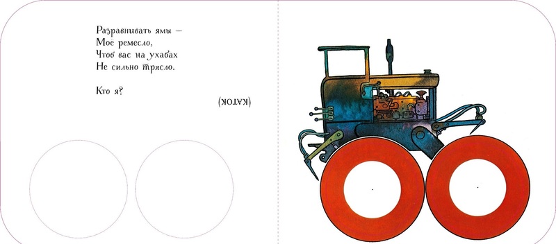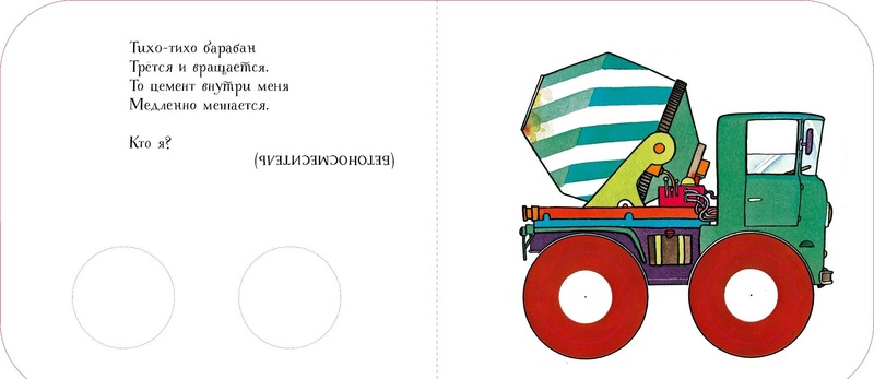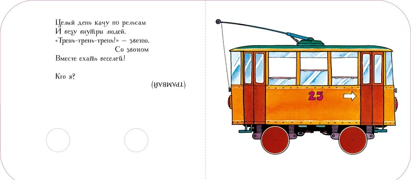 На каждой страничке книги - стишок-загадка, а рядом картинка машины или другого средства передвижения на колесах. А вместо колес - вырезанные круги, через которые можно смотреть на мир!