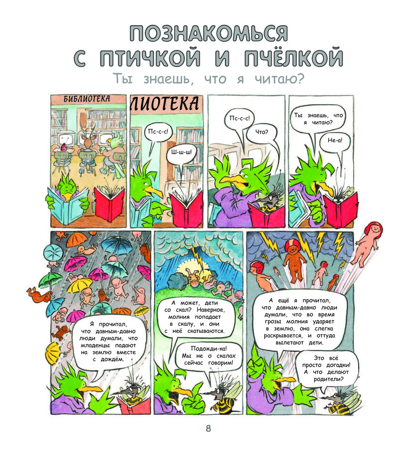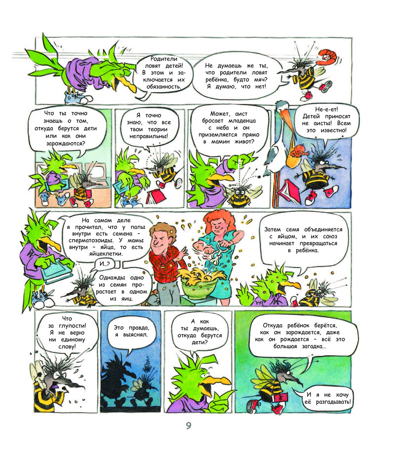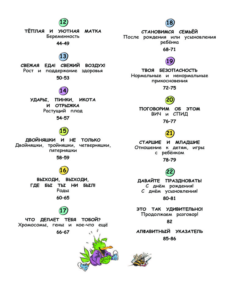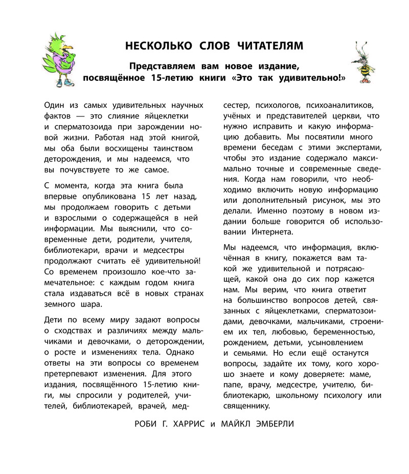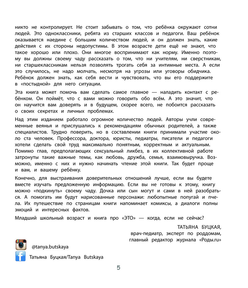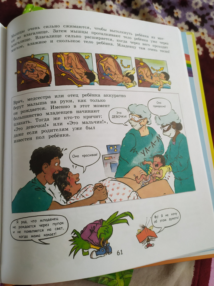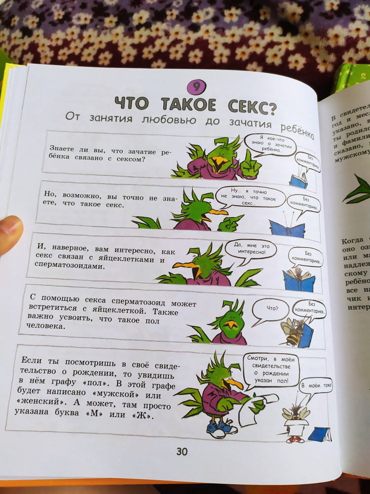 Великолепная книга. Огромное количество иллюстраций. Два героя, которые сопровождают от начала до конца в процессе чтения идеально показывают, что может чувствовать ребёнок, читая книгу. Наш папа вел себя как пчела. 😂 Был очень смущён темой. Информация в книге исчерпывающая. Даны ответы на все вопросы, которые могут возникать у ребёнка в возрасте 7-8 лет. Есть момент воспитания толерантности. Проговорены многократно опасности ранней половой жизни. Даны советы, как себя вести. И всё это в лёгкой игровой форме. Не перегружает ребёнка лишними подробностями. Готовит к правильному восприятию подобной информации в будущем. Не запугивает. Корректно воспитывает ответственность. Сын в восторге. Просит купить ещё таких же интересных книг.