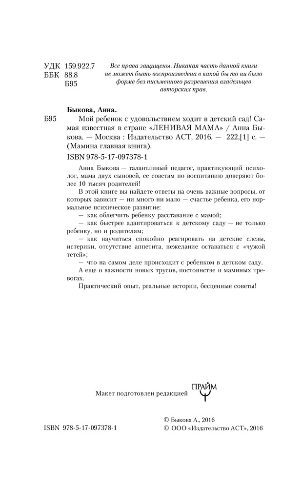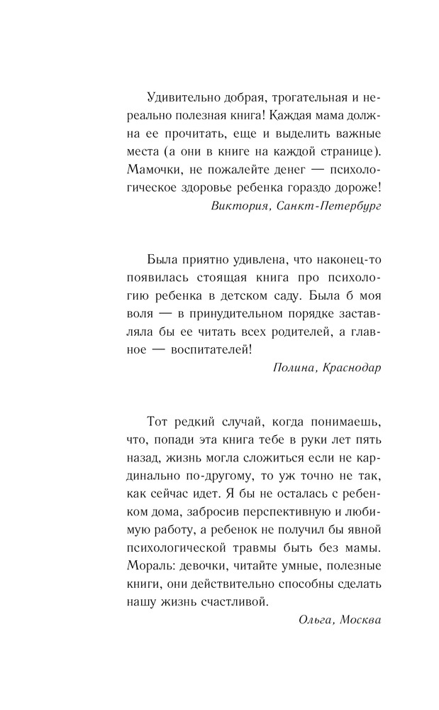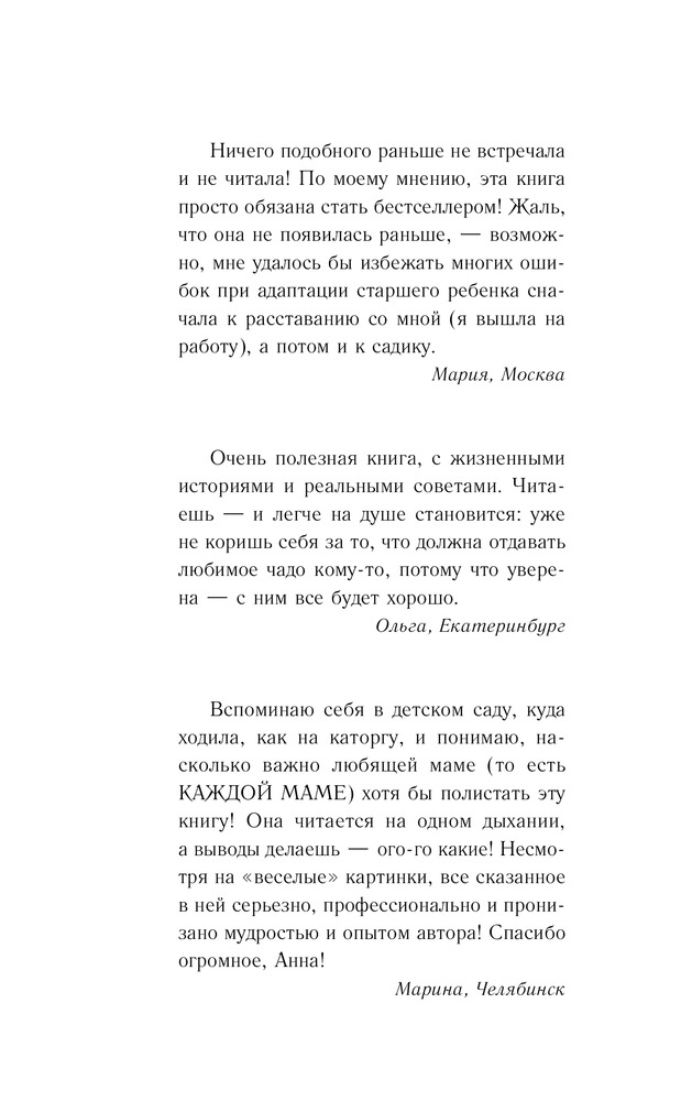 Отличная книга, замечательный психолог-автор. Прочитала две ее книги. Покупала специально перед периодом адаптации ребенка в сад. Книга меня успокоила и теперь я без страха готова отдавать ребенка в садик.
