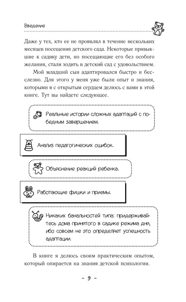 Советую к прочтению. Всем, у кого есть дети в возрасте до 5 лет. В этой книге есть все ответы про садик. Водить или нет, как, в чем, план адаптации, если не водить , то чем заменить. Читается на одном дыхании.